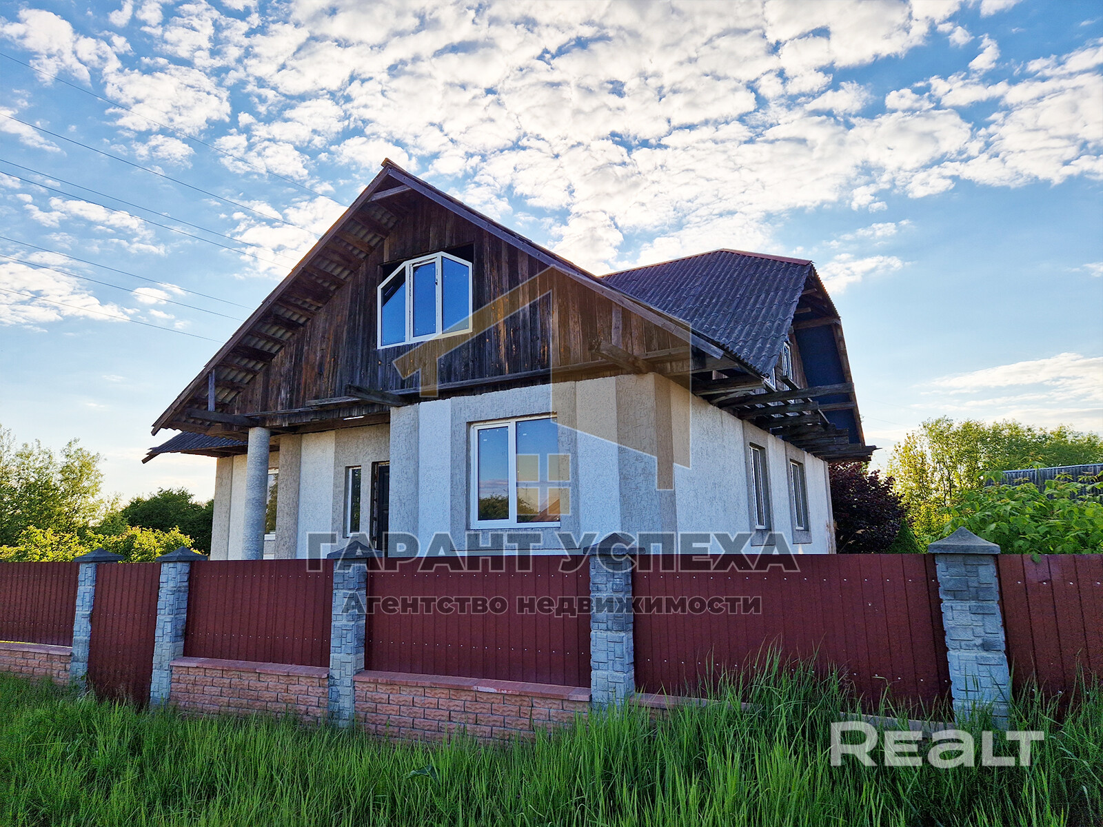 Дом построен из газосиликатных блоков, обшит 50 мм пенополистирола и покрыт декоративно-отделочным слоем, установлены окна ПВХ. Проект предусматривает 2 этажа, 4 жилые комнаты.