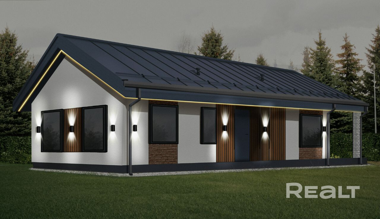 По плану в доме предусмотрены 3 отдельные комнаты. Гостиная имеет площадь 28 квадратных метров, а кухня — 14 квадратных метров, с выходом на просторную террасу площадью 27 квадратных метров. В доме имеется раздельный санузел. Обратите внимание, что дом находится в стадии строительства.