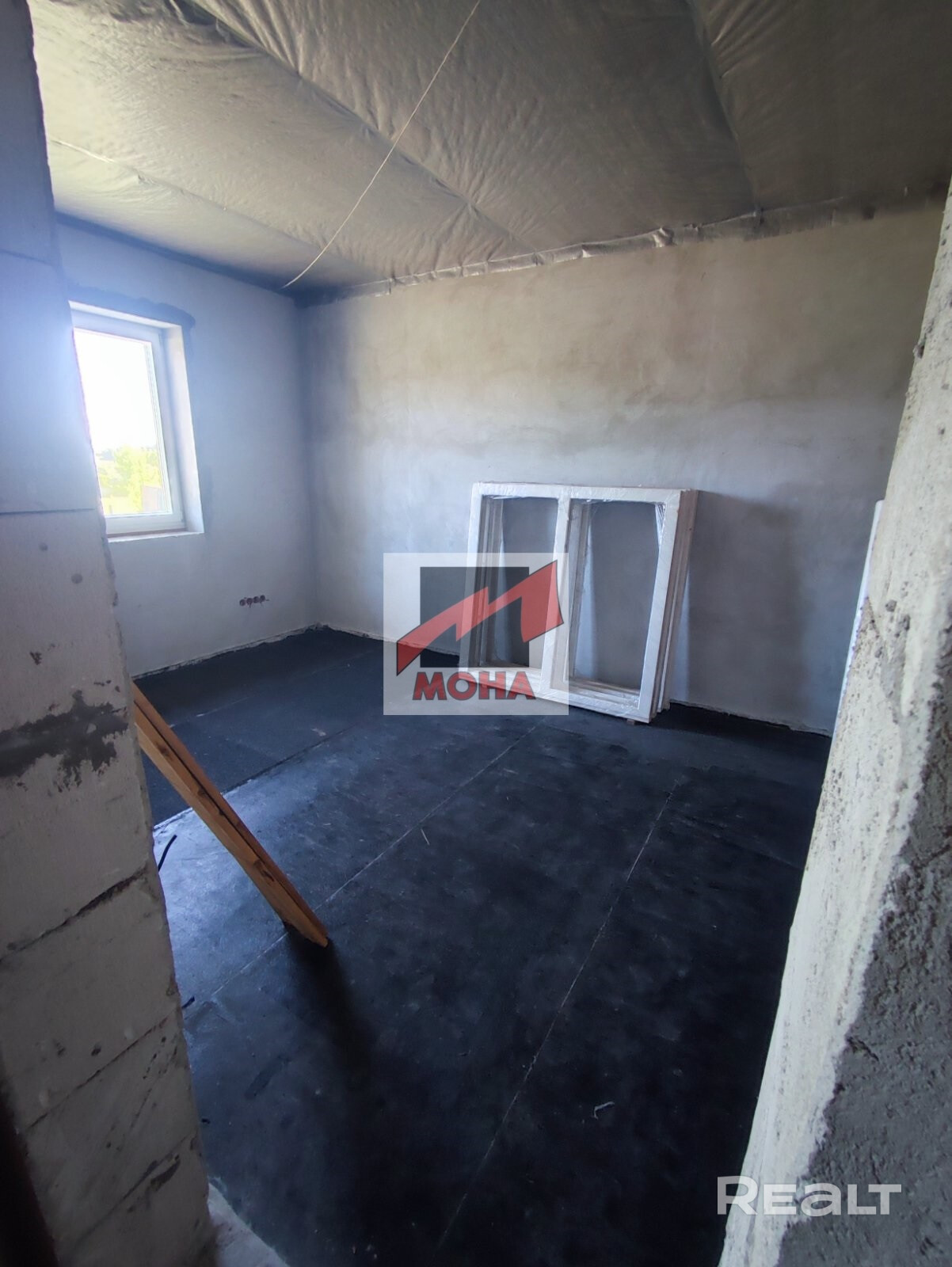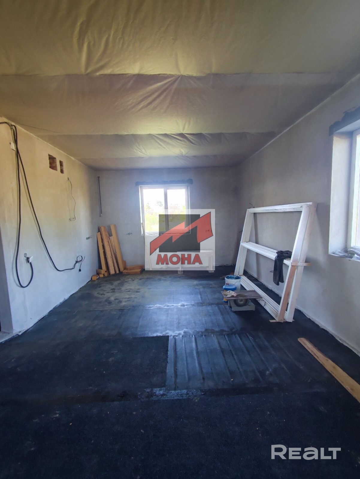 Произведена разводка электричества, сделаны выводы канализации. В доме черновой бетонный пол с наплавлением гидроизоляции.