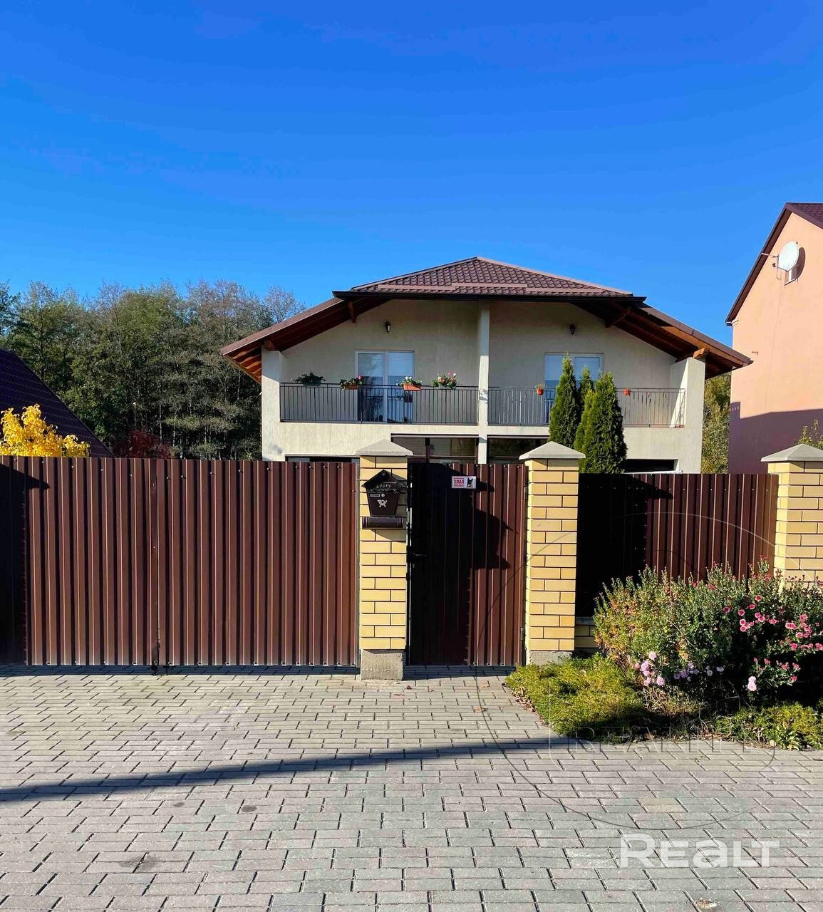 Полностью огороженный, ухоженный участок с декоративными, цветущими и вечнозелёными растениями. Зеленый газон и "огород без фанатизма". Тротуарная плитка.
