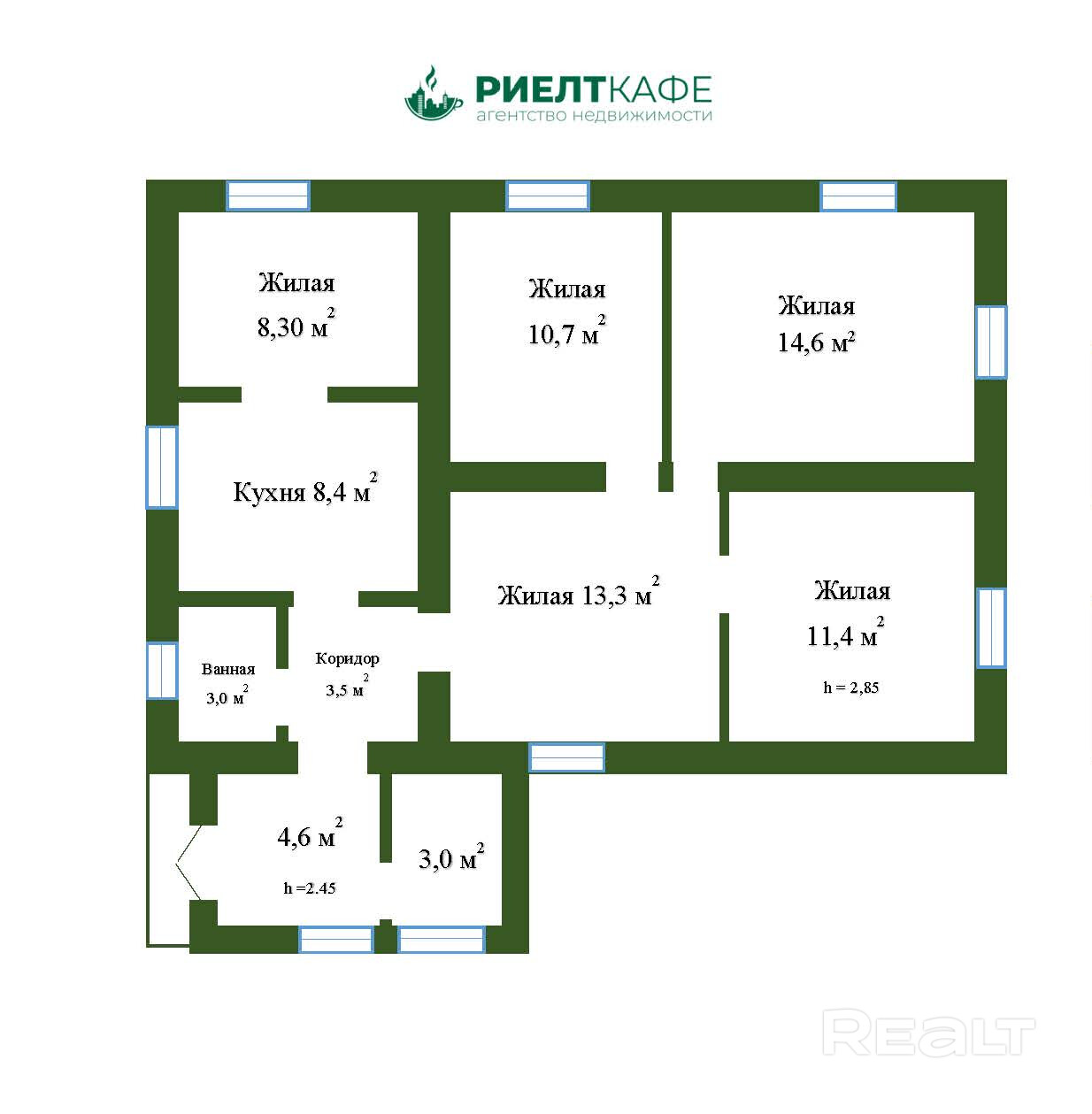 Дом состоит из четырех жилых комнат, кухни, столовой, совмещенного санузла, коридора. Установлены окна ПВХ. Входная дверь - металлическая.