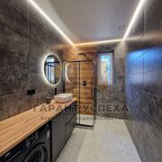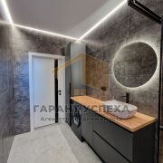 Ванная отдельно от туалета. Тут все выдержано в серых тонах с использованием плитки с рисунком «под дерево». Подсветка по периметру создает вид парящего потолка.