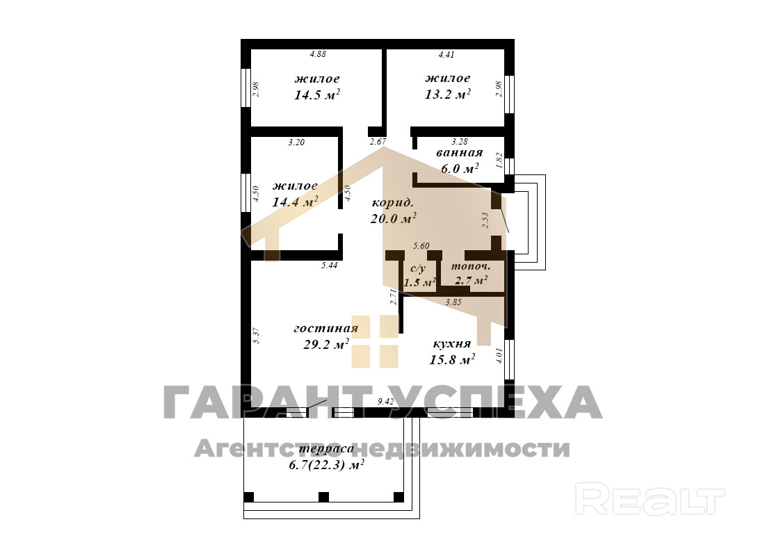 Общая площадь – 131,7 кв. м, жилая – 71,3 кв. м, кухня – 15,8 кв. м. Высота потолка – 2,9 м. Три жилые комнаты 14,5/14,5/13,2 кв. м. Просторная крытая терраса в 16 кв. м. с видом на лес.