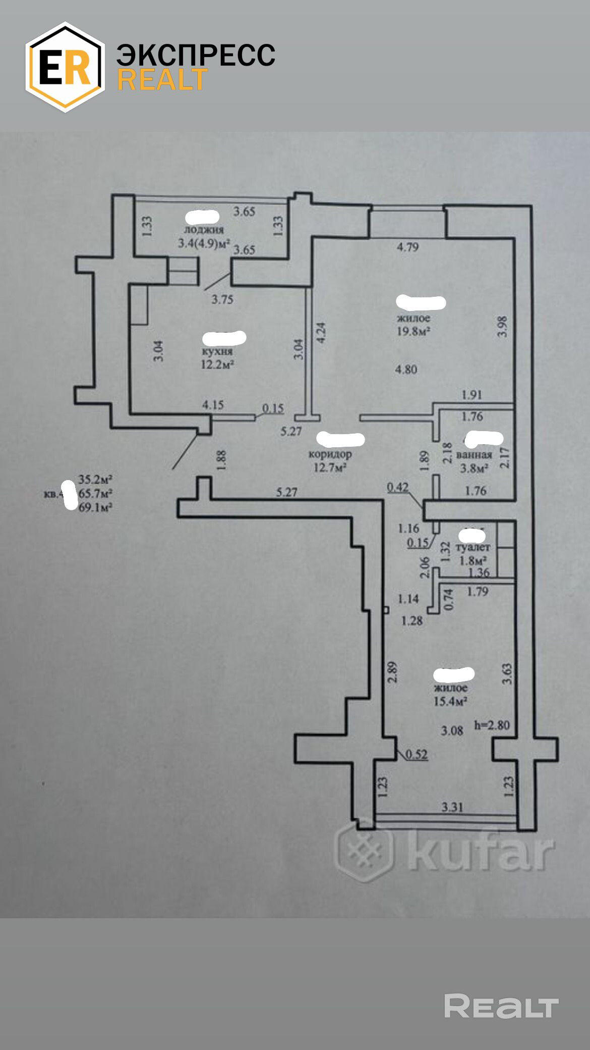 Площадь квартиры по СНБ 69,1 м2, общая площадь 65,7 м2, жилая площадь 35,2 м2, кухня 12,2 м2.