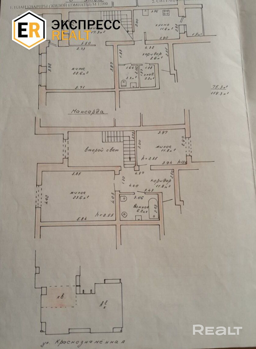 Продается просторная двухуровневая квартира с индивидуальным проектом в центре Бреста по улице Краснознамённой. Квартира расположена на 5 этаже 5-этажного кирпичного дома 2000 года постройки. Общая площадь – 119,3 м2, жилая площадь – 75,3 м2, кухня – 11,6 м2.