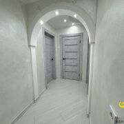 Стены в коридоре, кухне и детской комнате - декоративная штукатурка. В гостиной и спальне - виниловые обои.
