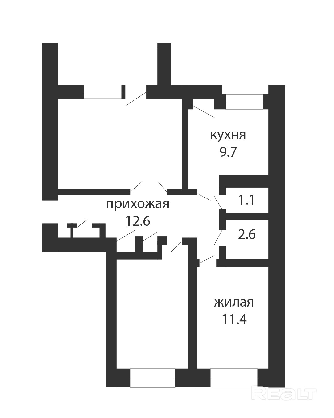 Часть квартиры (выделенная доля) в трёхкомнатной квартире, предлагается к продаже одна комната площадью 11,4 м2. Также в вашем распоряжении кухня площадью 9,7 м2, прихожая площадью 12,6 м2 и раздельный санузел.