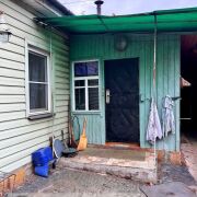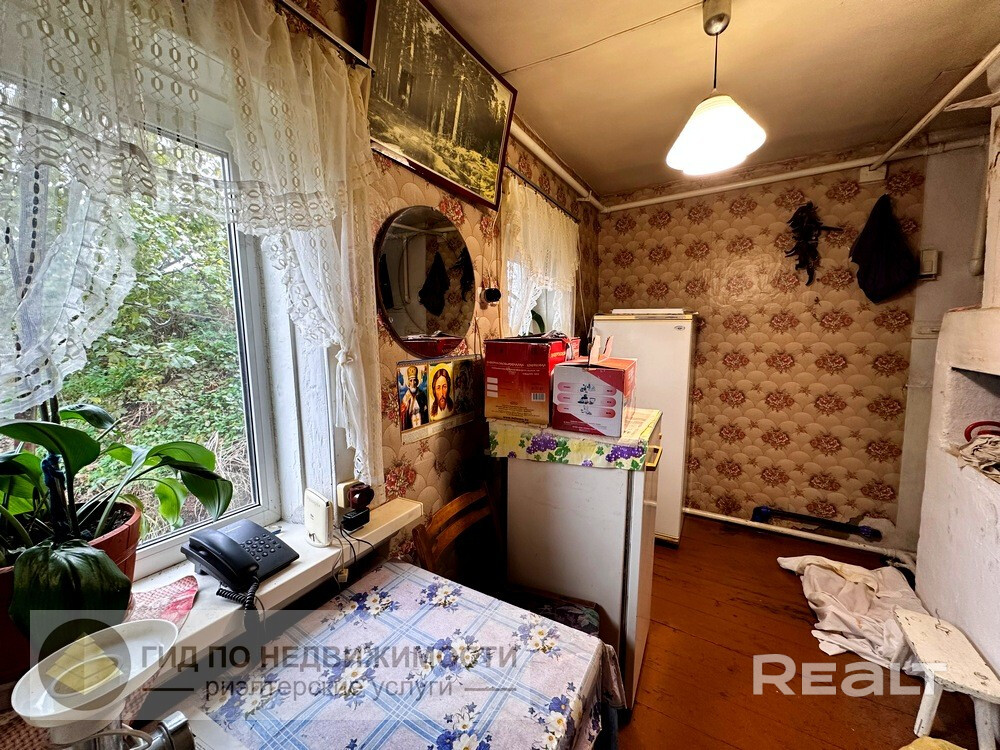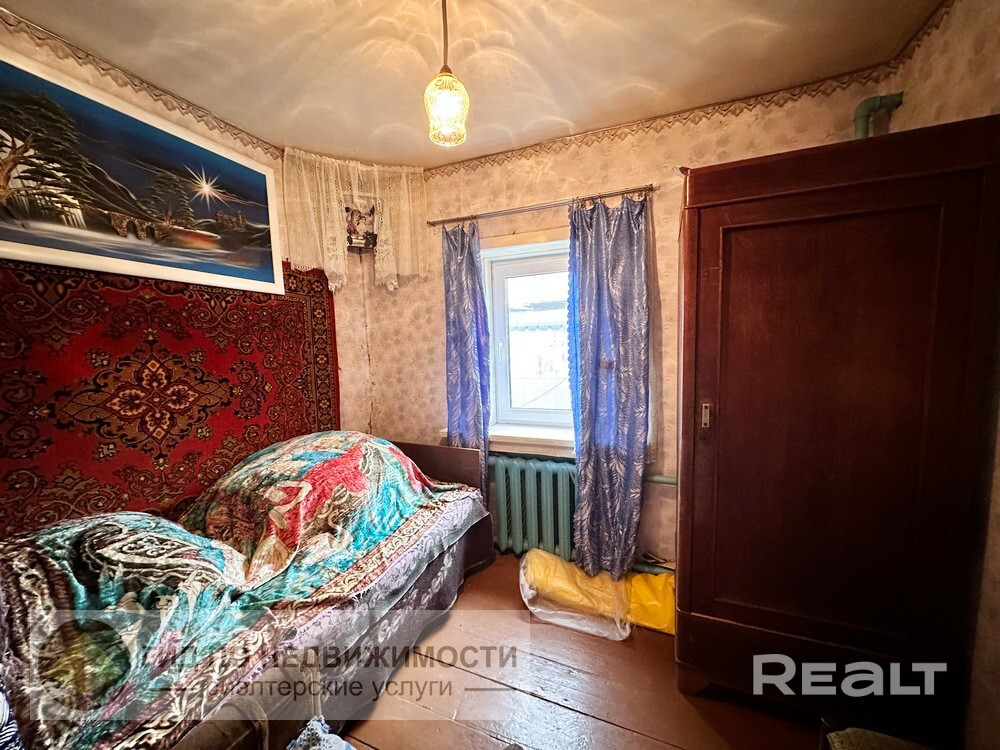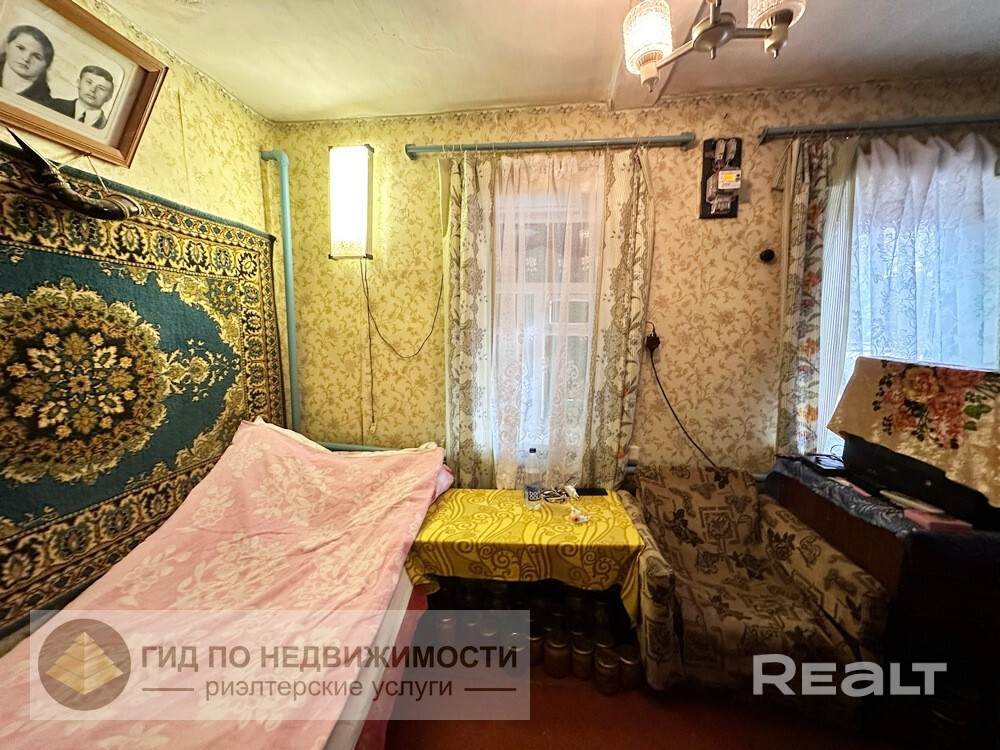 Продается одноэтажный жилой бревенчатый дом в агрогородке Ерёмино по улице Советская, площадью 87 кв.м., состоящий из 5-ти жилых комнат (площадью 20,5 кв.м., 5,8 кв.м., 6,5 кв.м., 8,3 кв.м., 7,8 кв.м.), двух кухонь (площадью 9,6 кв.м., 16,4 кв.м.), в одной из которых установлена печь, в другой – газовая плита, кладовой, предбанника. Фундамент дома кирпичный, крыша – шифер. Год постройки 1967. В доме установлены пластиковые окна, полы – дощатые, стены - обои. В дом заведены свет, газ, вода. Также установлен газовый котел на отопление и городской телефон.