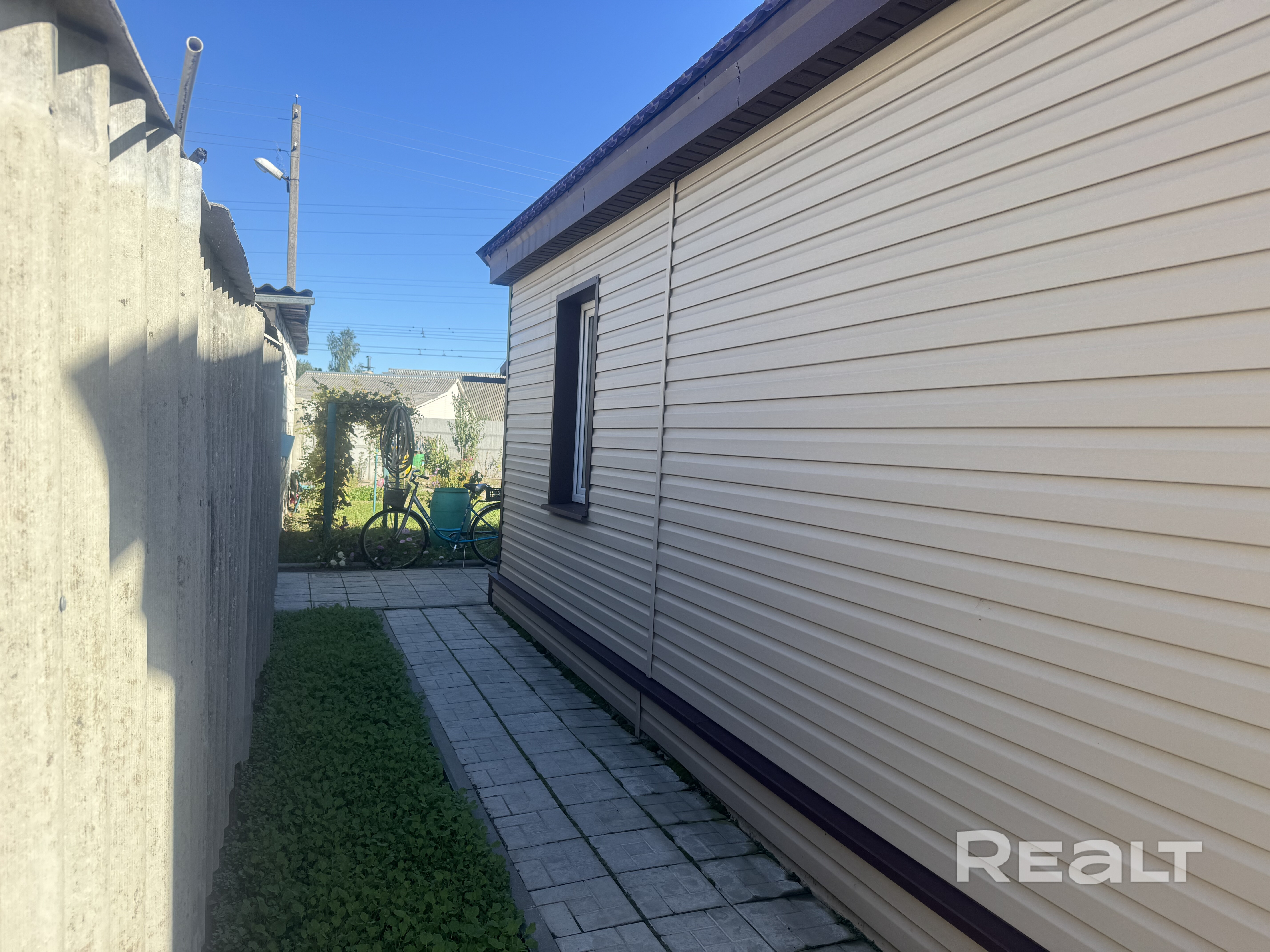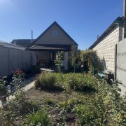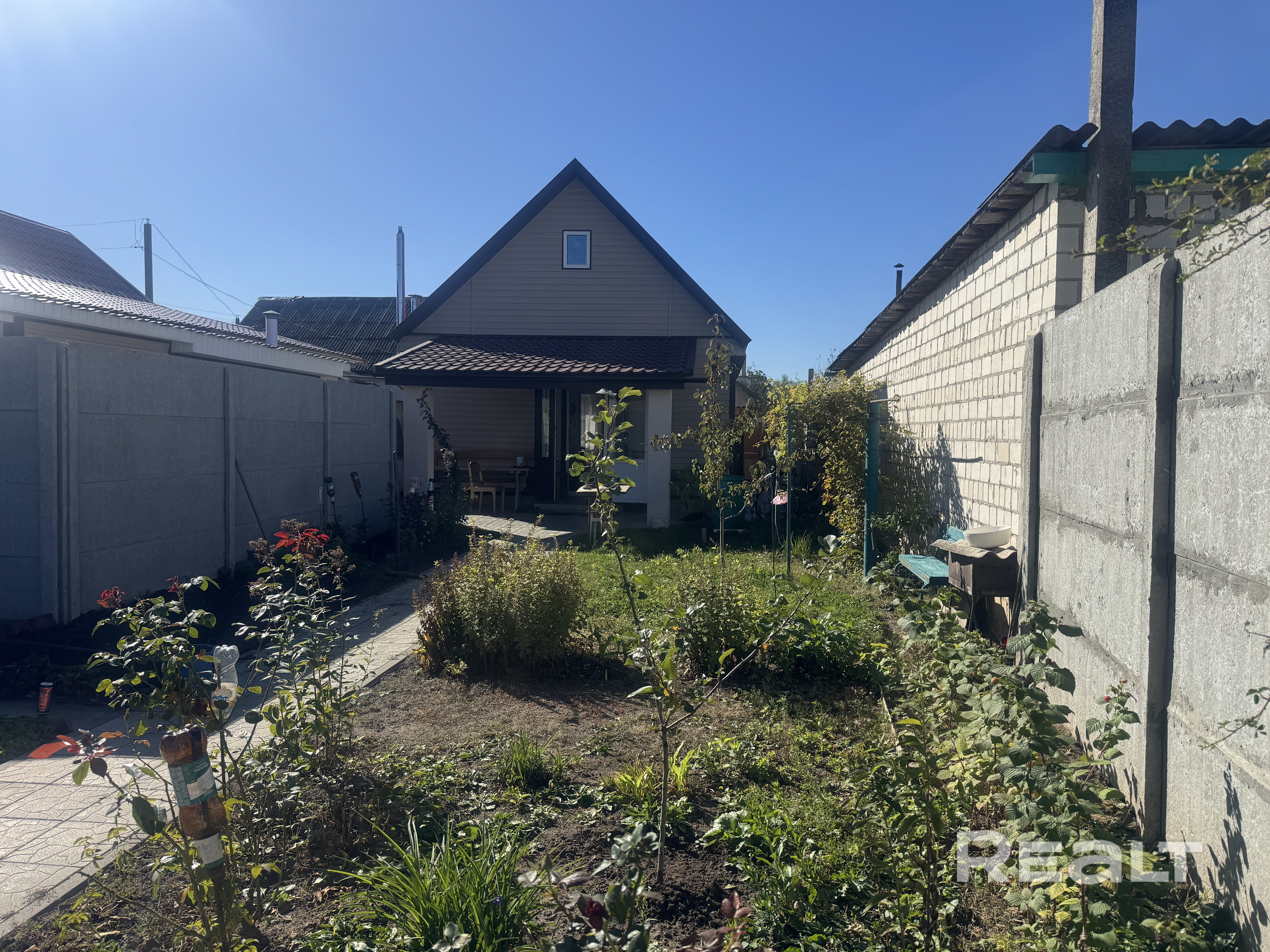 Участок огражден со всех сторон бетонным забором, по территории выложены дорожки плиткой, зона огорода разделена на грядки с проходами, много цветов и молодых плодовых деревьев. В углу участка находится современная баня с уличной зоной отдыха и барбекю, Есть хозпостройка и дровница.