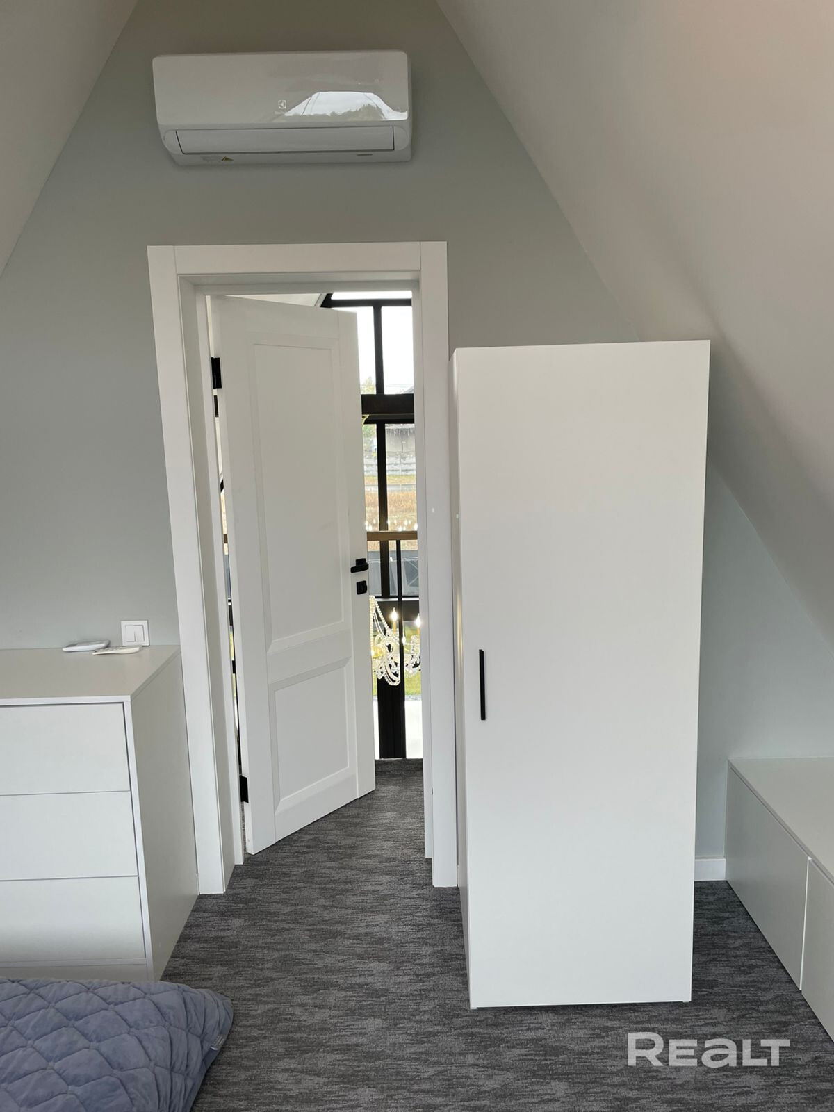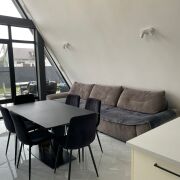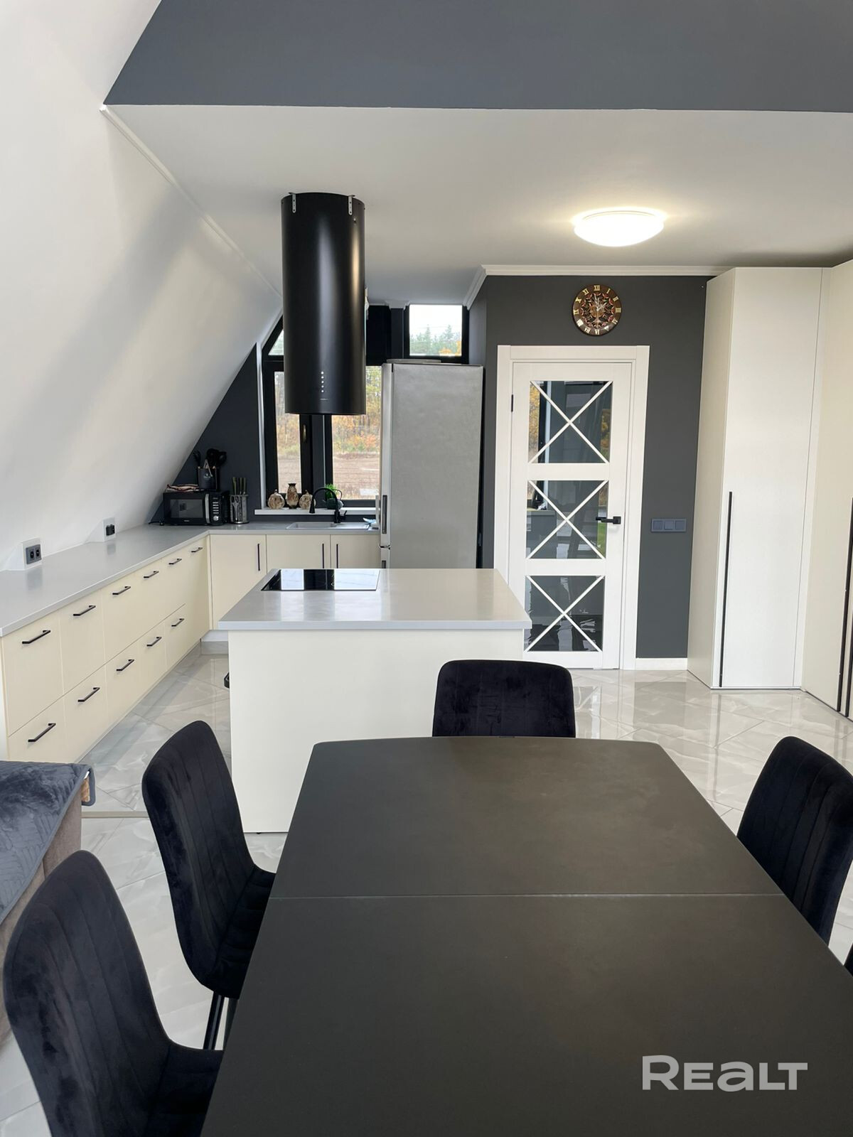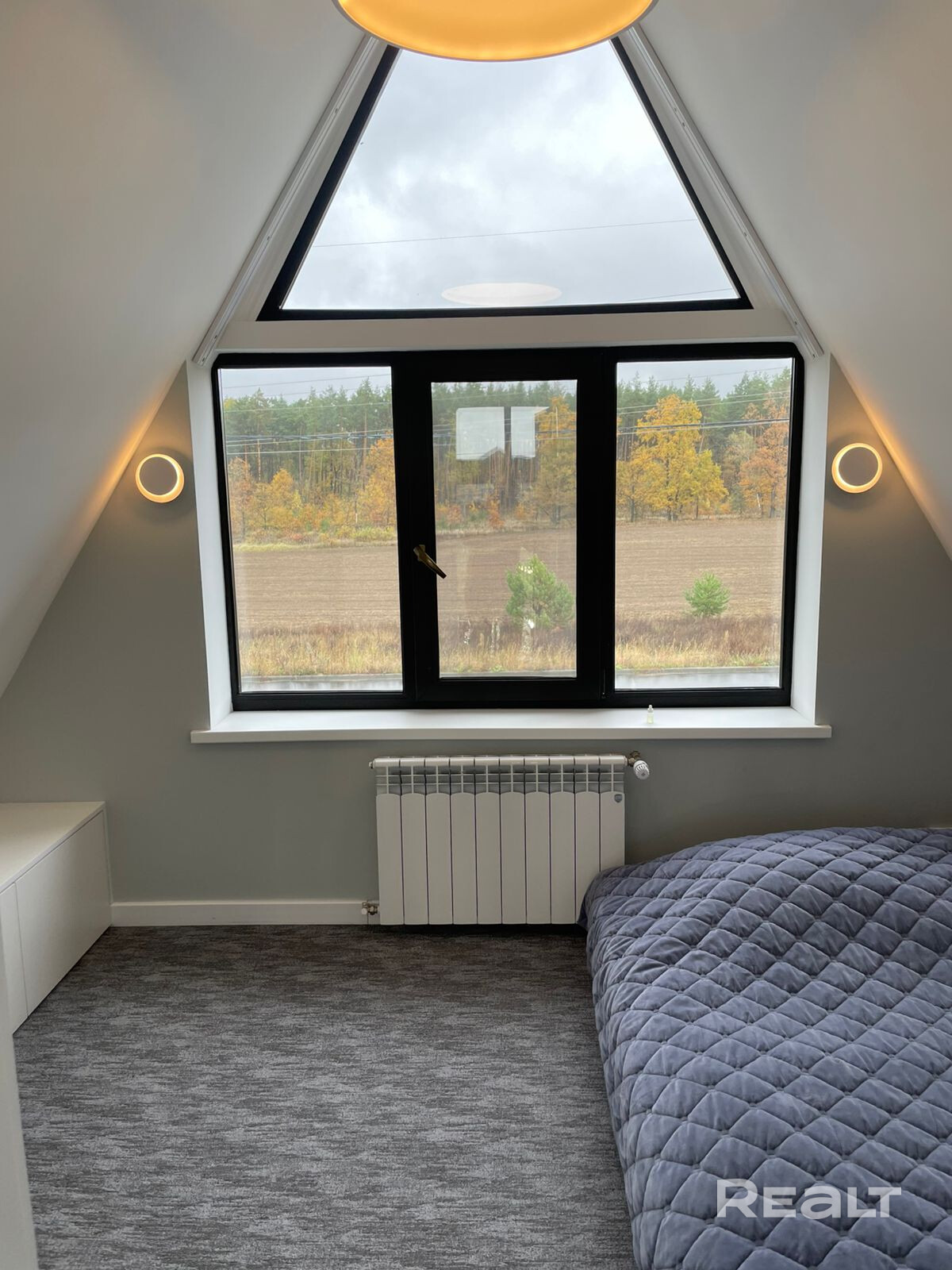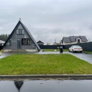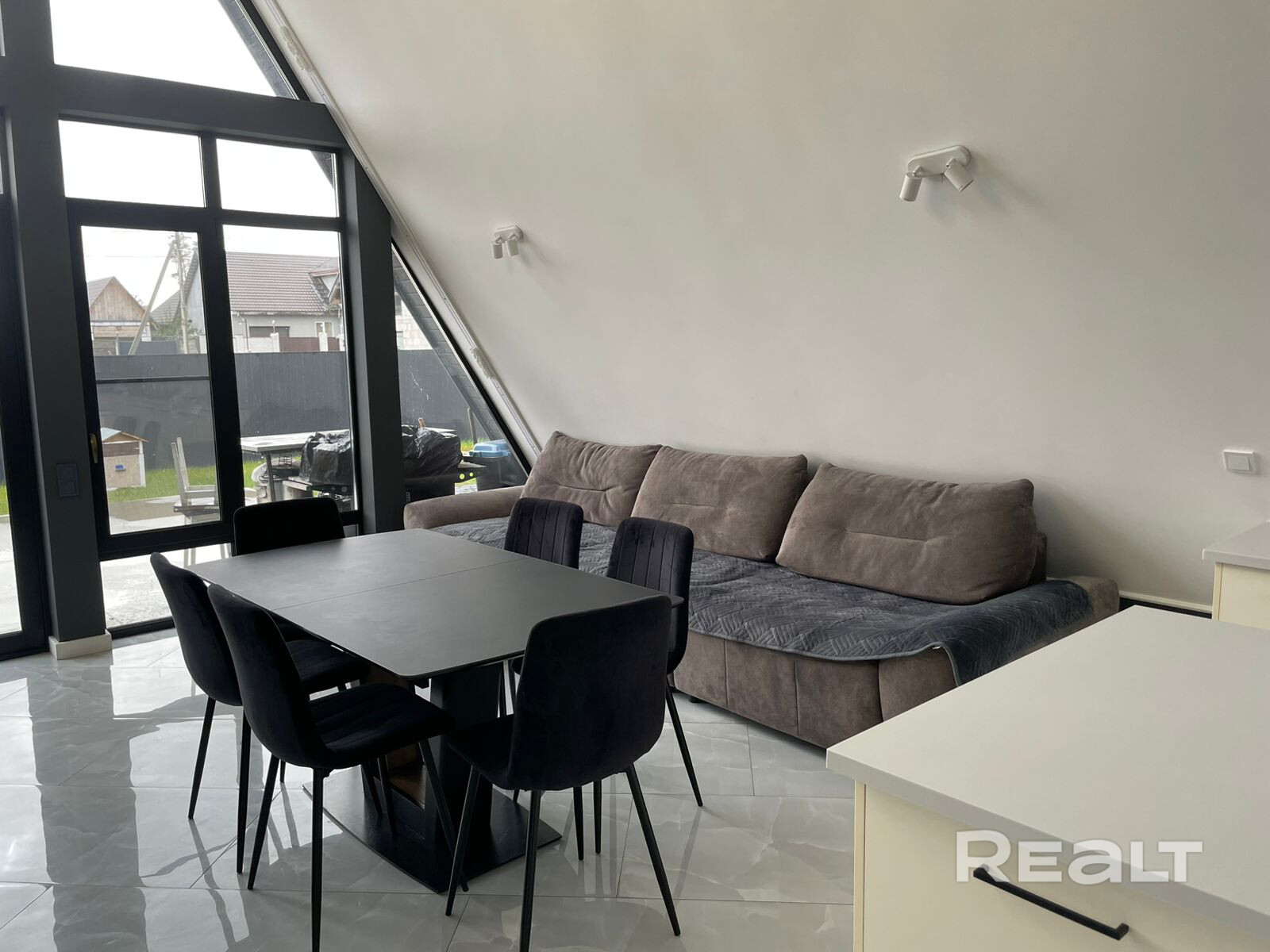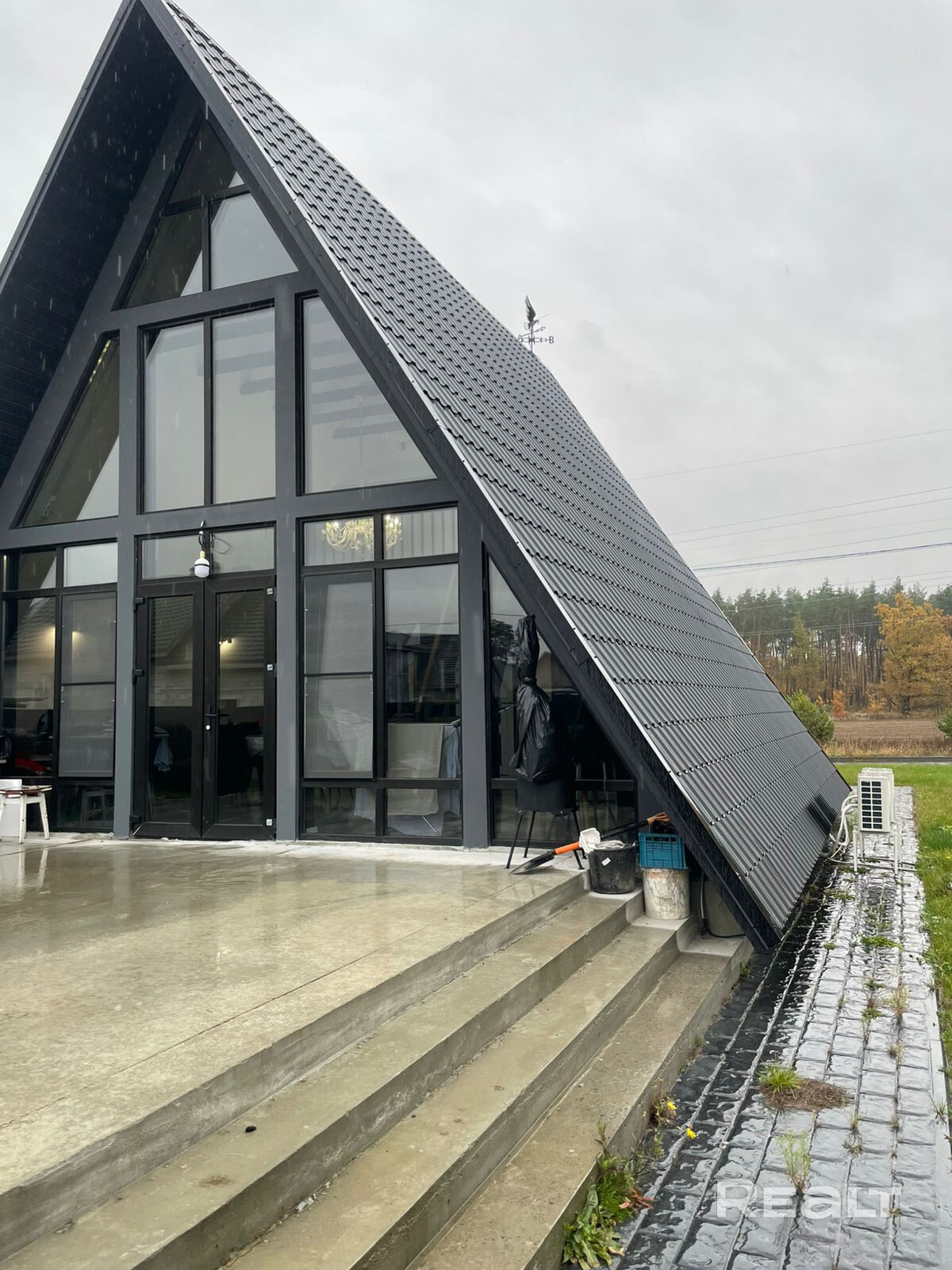Дом находится в тихом месте района "Романовичи". С одной стороны дома лес, где не планируется новых построек, с другой стороны, недалеко от дома, участок леса и озеро. Соседи проживают только с одной стороны. С двух других на текущий момент (уже долгое время) соседей нет. Дом в стиле A-frame, со всеми плюсами и минусами данного формата дома. Обычно такие дома строят для временного (периодичного) проживания, но данный дом строился именно для постоянного проживания.