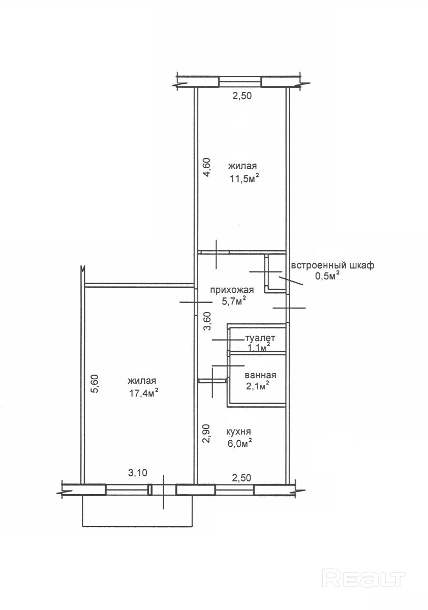 - стандартная планировка квартиры площадью 44,0 кв.м;
