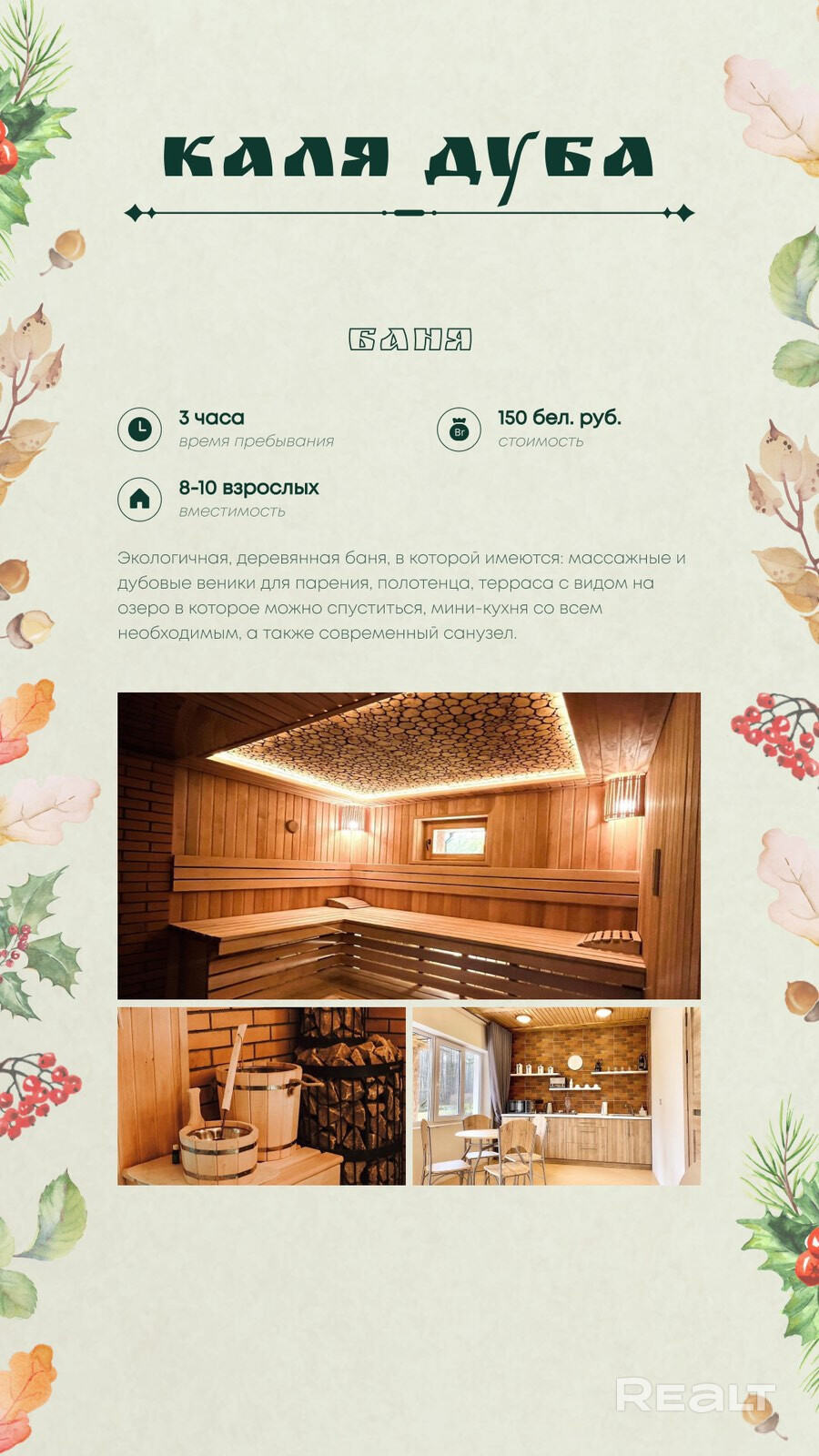 Агроусадьба Каля дуба расположена в поселке Тетейки Гродненской области. Тихий и веселый отдых для всей семьи! На территории усадьбы расположены два гостевых дома – один маленький аутентичный домик с русской печью для небольшой компании или семьи, второй – двухэтажный коттедж с жилыми комнатами на втором этаже и банкетным залом на первом. Также на территории – две беседки, баня, пруд, где можно порыбачить или покататься на лодке. Есть большая терраса для танцев и зона отдыха с лежаками. Есть в