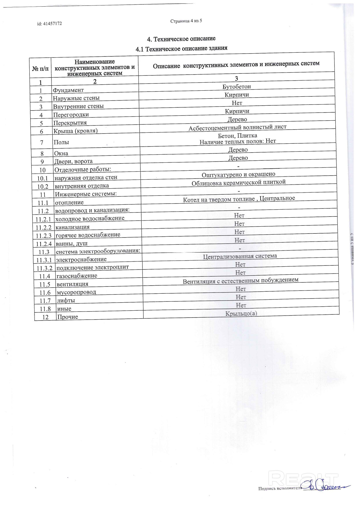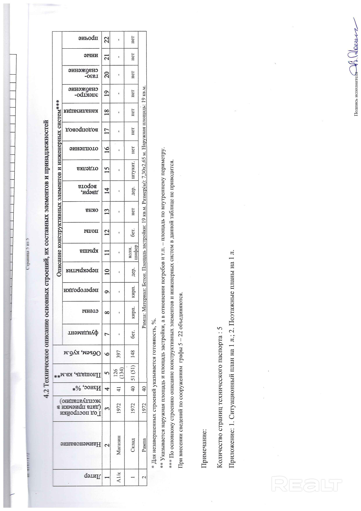 Описание магазина: вид конструкции здания - бескаркасная, материал наружных стен - кирпич. Фундамент - бутобетон, перегородки - кирпичи, крыша - асбестоцементный волнистый лист. Отопление - котел на твердом топливе. Электроснабжение - централизованная система. Вентиляция с естественным побуждением. Имеется крыльцо.