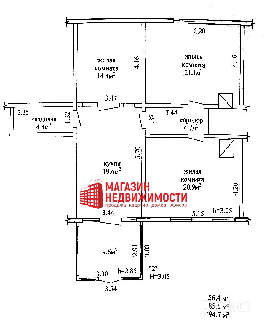 Общая информация о доме: Общая площадь квартиры по СНБ- 94,7 кв.м. Общая площадь жилого помещения (квартиры)- 85,1 кв.м. Жилая площадь квартиры- 56,4 кв.м.