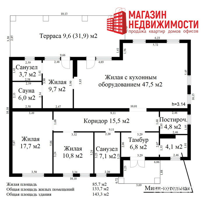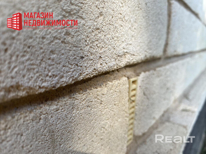 Степень готовности дома 90%. Материал наружных стен — красный керамический кирпич 2.1 NF производства ЛСР (RAUF), перегородки — полнотелый красный керамический кирпич, крыша — модульная металлочерепица, монолитный фундамент на глубину 1800 с опиранием шириной 600 мм. Окна в доме ПВХ с профилем 80 мм., стеклопакеты двухкамерные 48 мм энерго-сберегающие. Все окна смонтированы с выносом в зону утеплителя (минеральной ваты).