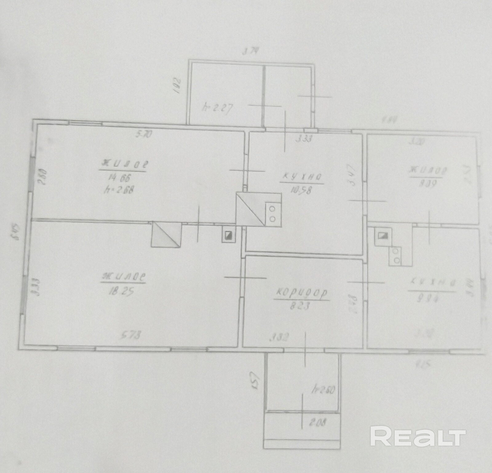 В доме 3 большие изолированные комнаты и две кухни площадью 10.58 м. кв. и 9.94 м. кв., одну кухню можно переделать под жилую. Вход в дом с двух сторон, при желании можно сделать дом на две половины.