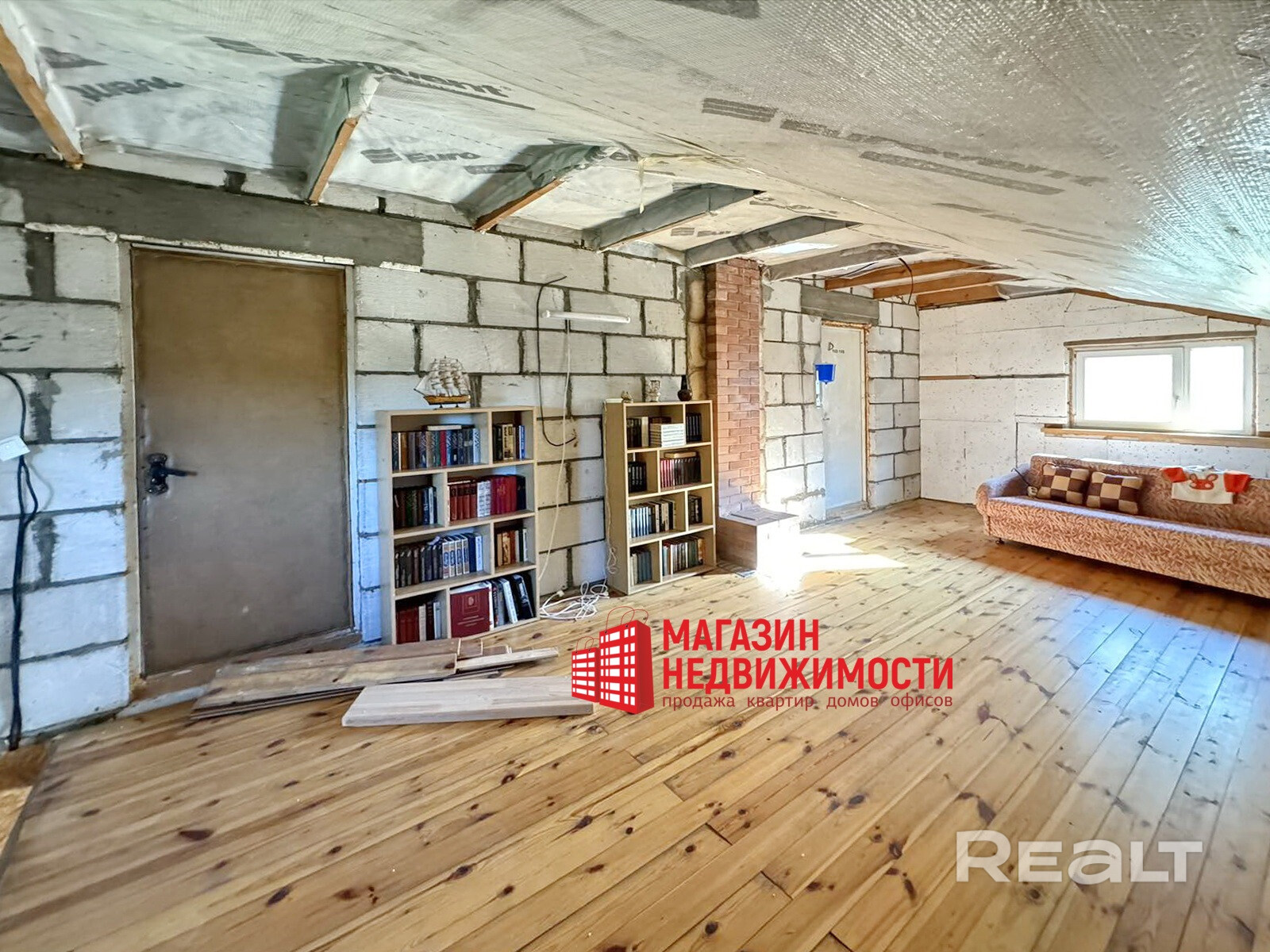 Первый этаж дома обшит вагонкой, полы дерево. Есть совмещенный санузел. Вода и канализация введены в санузел. Второй этаж готов под чистовую отделку. Есть возможность организовать две изолированные спальни.