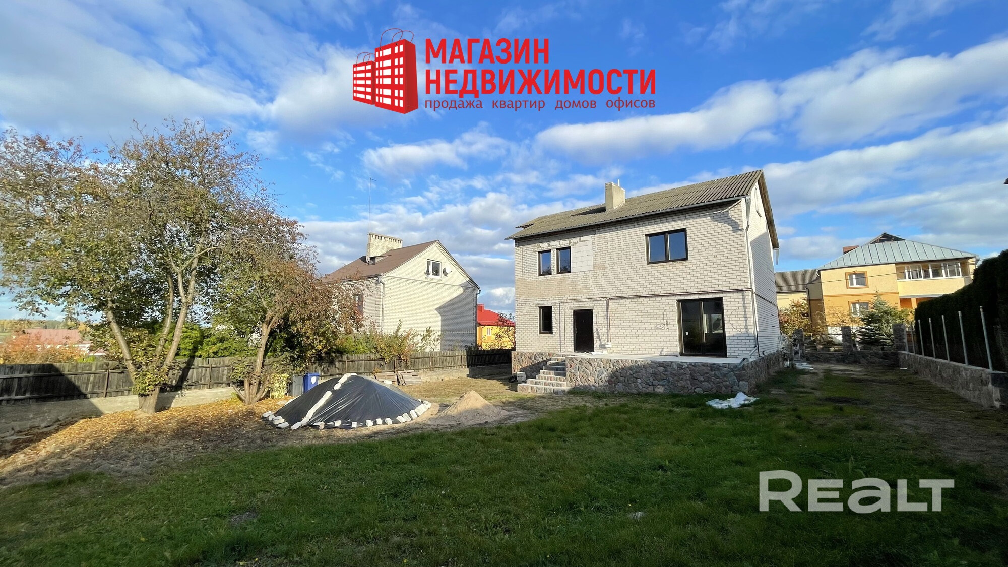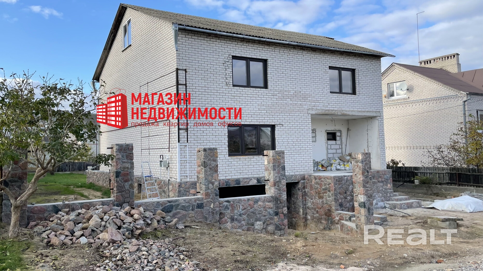 Материал стен – блок, обложен кирпичом, фундамент – бетон, перекрытия – ж/б плиты, крыша – шифер, стропильная система с огнеупорной обработкой, материал полов – стяжка, стены – под чистовую отделку. Окна – энергосберегающие двухкамерные ламинированные стеклопакеты Rehau. Входные двери металлические, гараж – роллетные ворота.