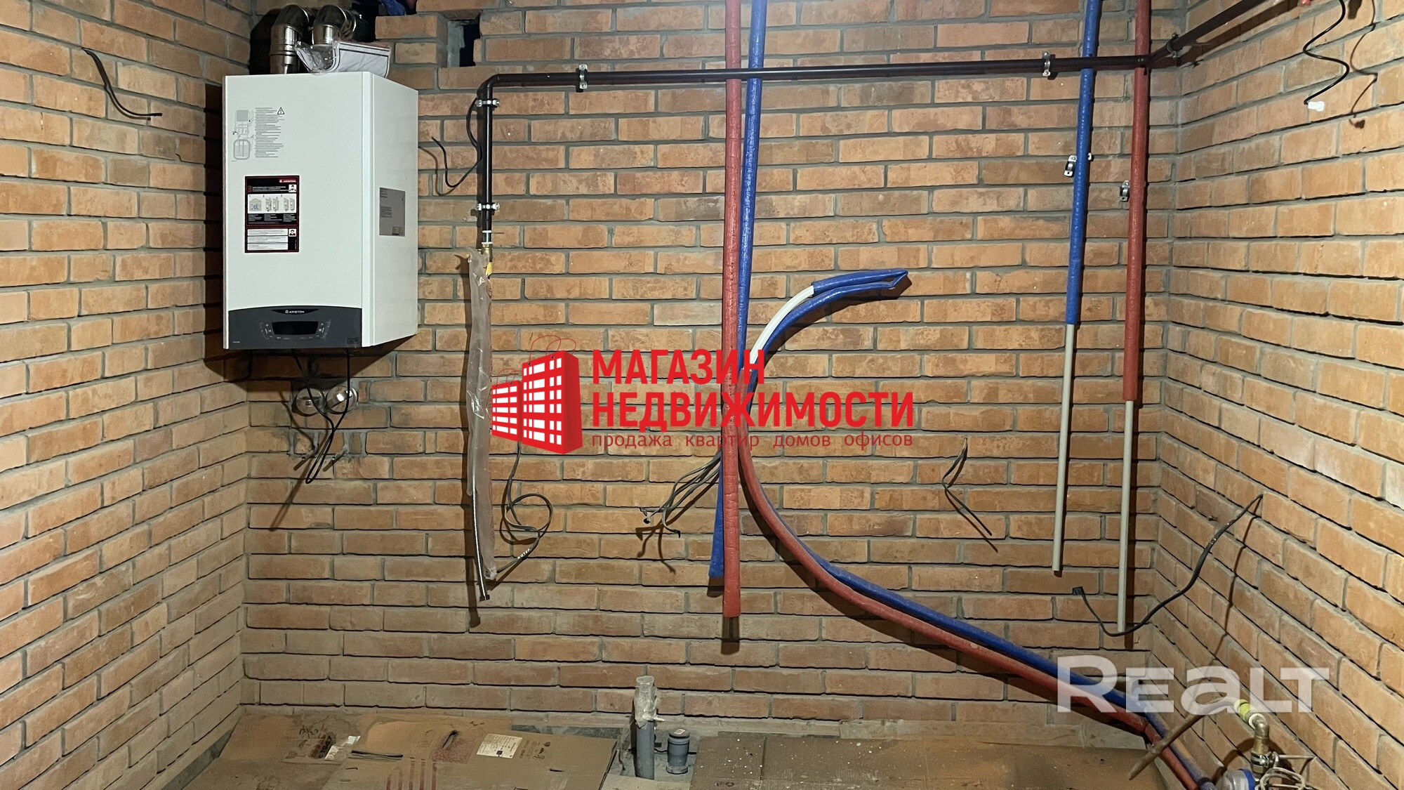 Коммуникации: электричество, канализация, водопровод, газ – центральные, отопление – двухконтурный котел «Ariston», алюминиевые радиаторы, «тёплый пол» устроен полностью на пером этаже, а также санузле второго этажа.
