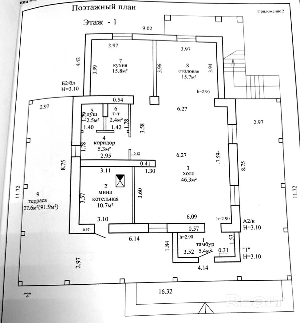 На 1 этаже находится гостиная, кухня, санузел, выход из гостиной и кухни на террасу.
