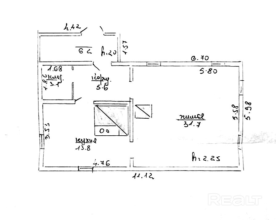 - общая площадь дома – 54,2 м.кв., жилая – 31,7м.кв, кухня- 13,8м.кв;