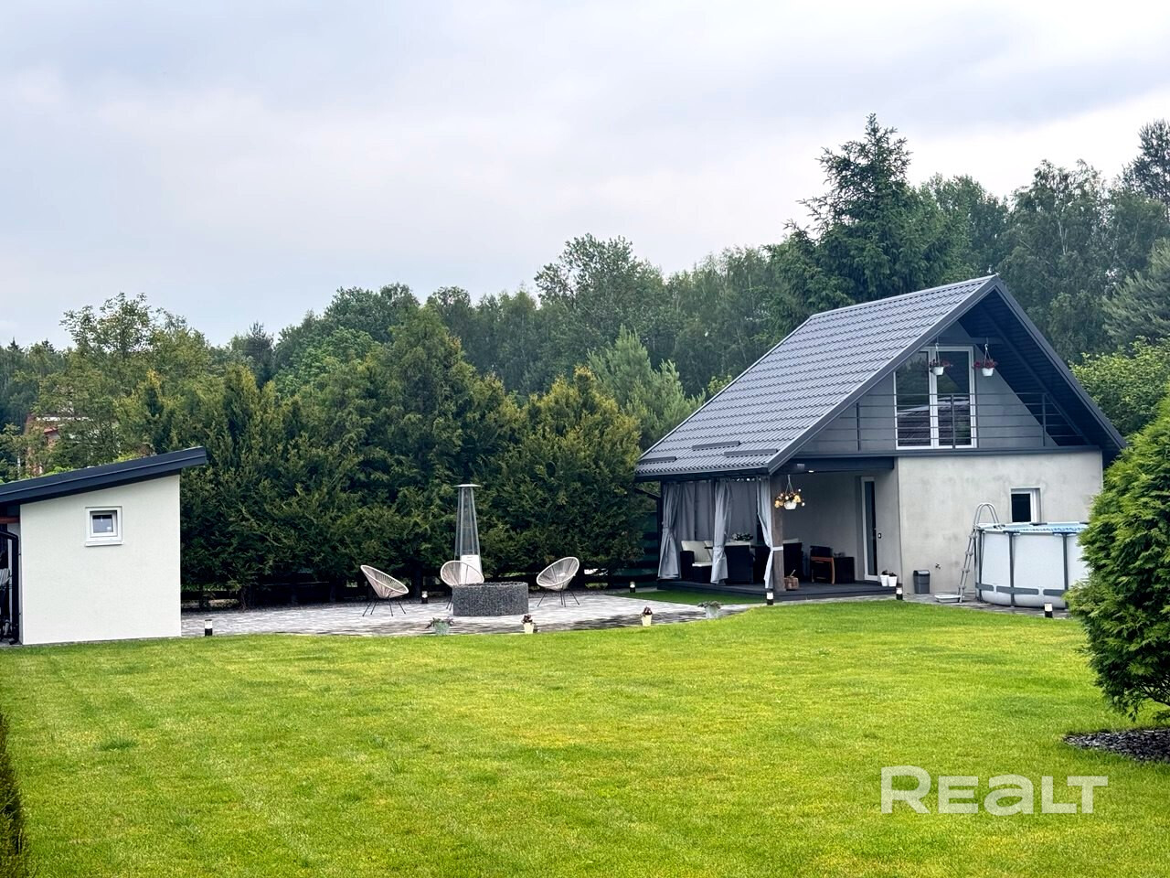 В гостевом доме вас ждет кухня и душевая с теплым полом, а также жаркая сауна. На втором этаже расположена комната отдыха с выходом на балкон, откуда открывается захватывающий вид на изумрудный лес. Терраса станет идеальным местом для вечерних посиделок у костра, а ухоженный газон (защищенный от кротов сеткой), подарит вам ощущение единения с природой.