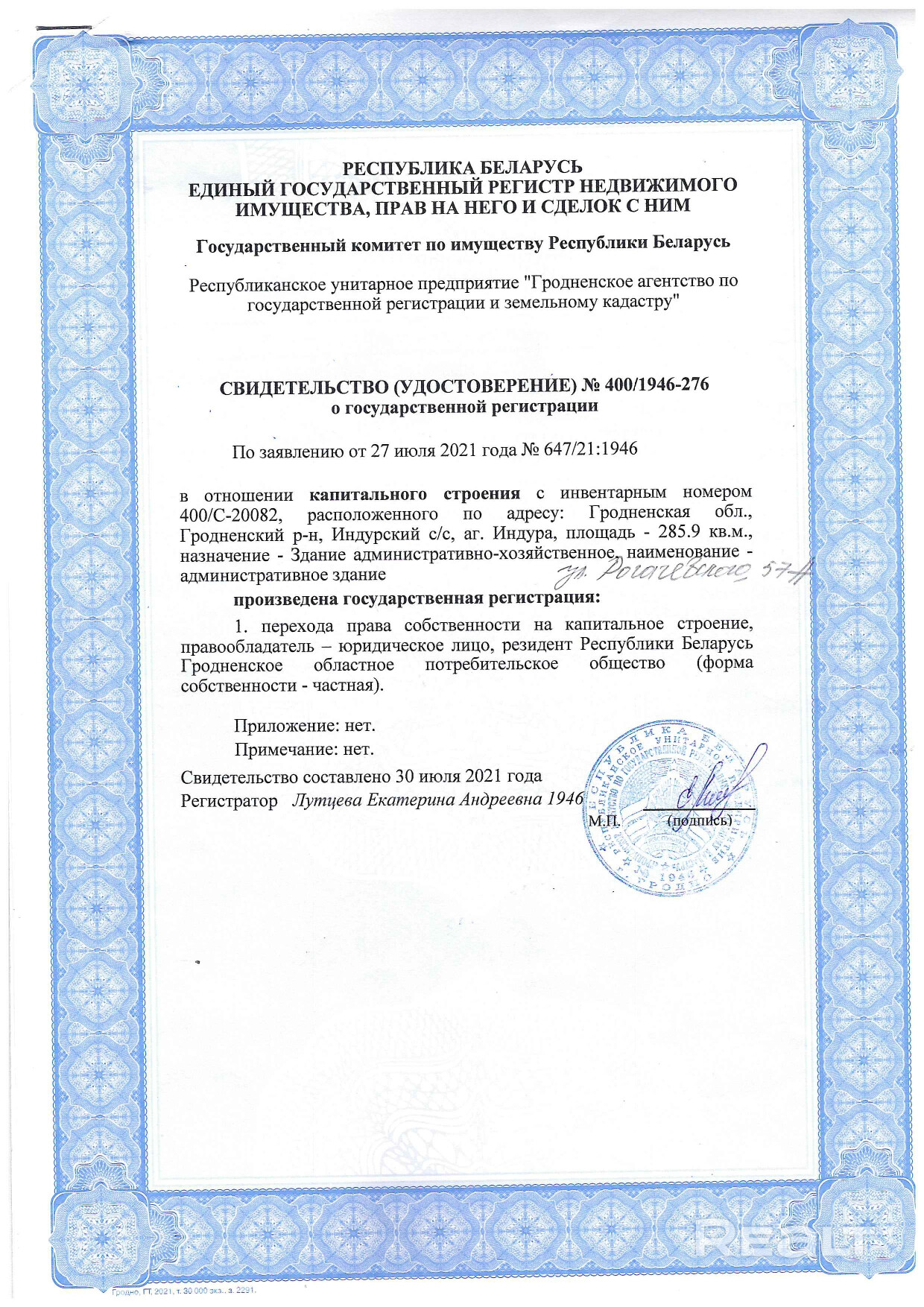 Объект не имеет обременений, принадлежит на праве собственности Гродненскому областному потребительскму обществу. Площадь земельного участка составляет 0,1062 га (право постоянного пользования), имеет ограничения (обременения) прав в использовании земель - земли, находящиеся в водоохранных зонах водных объектов вне прибрежных полос - 0,1062; земли, расположенные на природных территориях, подлежащих специальной охране (в зонах санитарной охраны источников питьевого водоснабжения) - 0,1062 га.