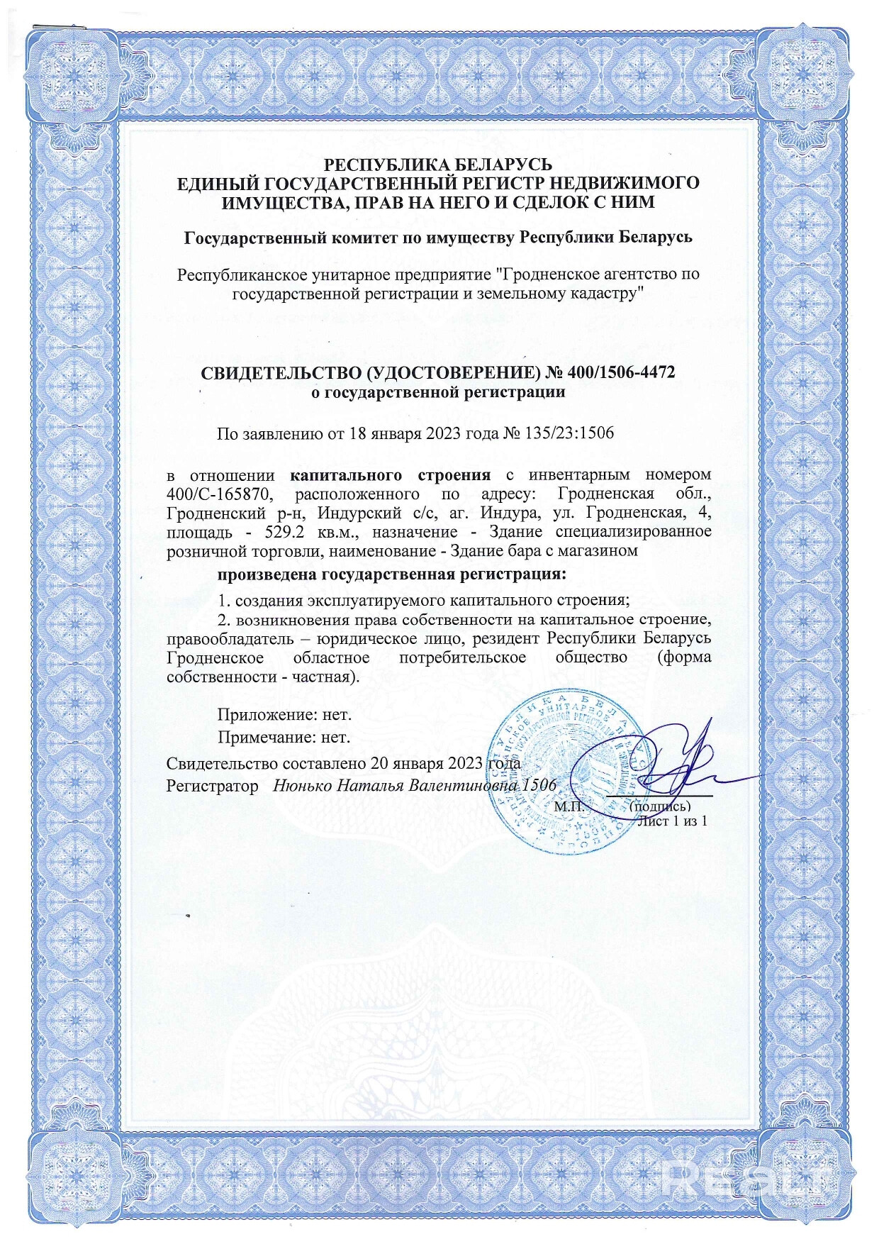 Объект принадлежит на праве собственност Гродненскому областному потребительскому обществу, заключен договор аренды на часть помещения бара с магазином (ИП Щербак).