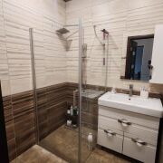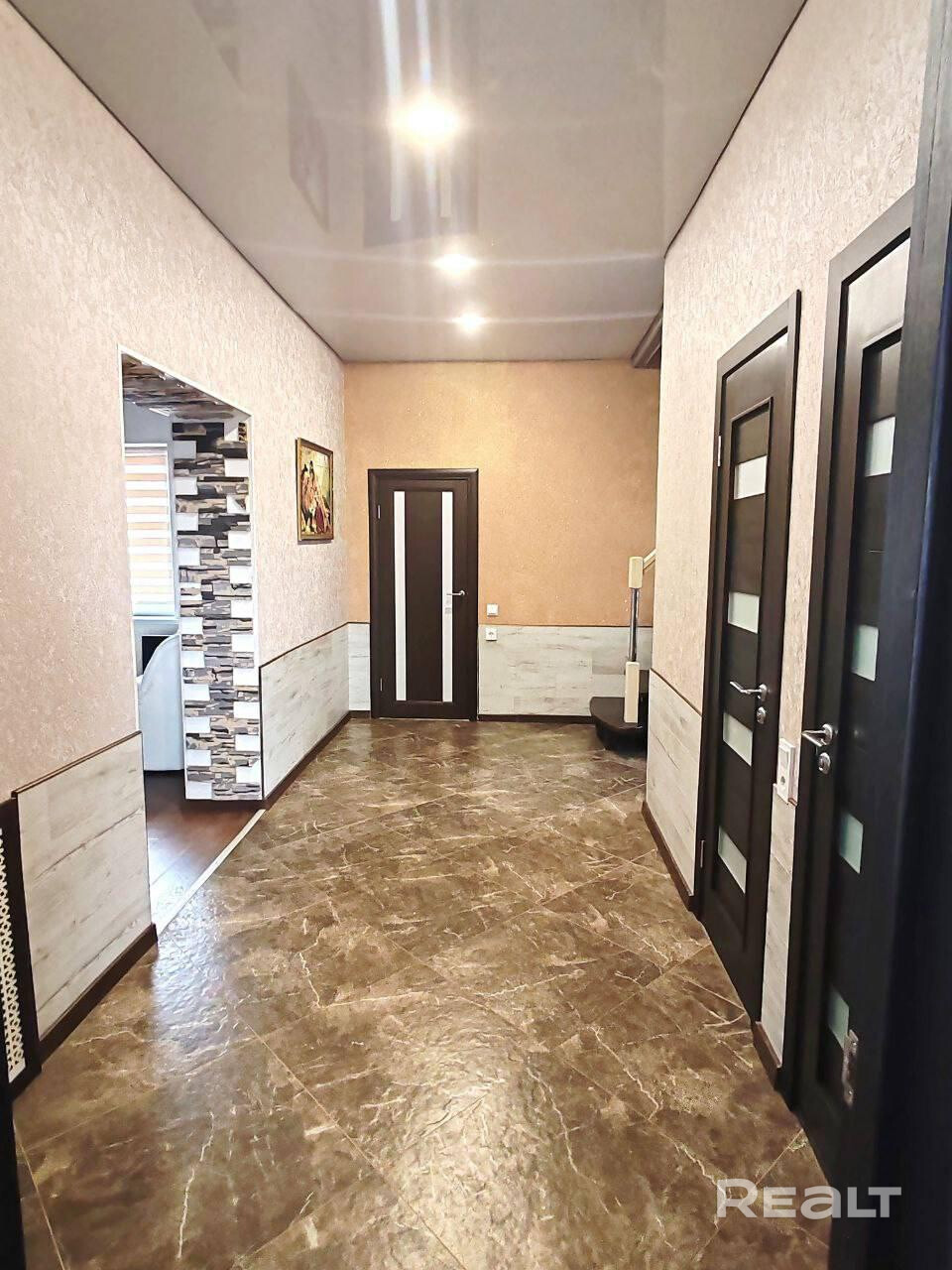 Коттедж полностью и капитально отделан внутри в современном стиле. Имеет два выхода: один во внутренний двор, второй на внешний фасад. Высота потолков 2,8 м. В нем индивидуальная система отопления от газового котла (экономный расход), теплые полы во всех помещениях на 1 этаже, установлены качественные радиаторы и стеклопакеты. Все коммуникации - центральные. В комнатах – ламинат, в санузлах, прихожей и на кухне – плитка (керамогранит). На стенах классические обои и декоративная штукатурка, что позволяет быстро и недорого изменить цвет интерьера. На первом этаже расположена зона кухни 12,6 м.кв., столовая, обустроена большая гардеробная, санузел и светлая просторная гостиная 33,3 м.кв. Встроенный кухонный гарнитур с газовой плитой с духовым шкафом, мойкой из искусственного камня.