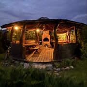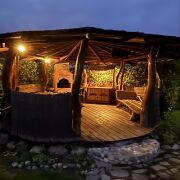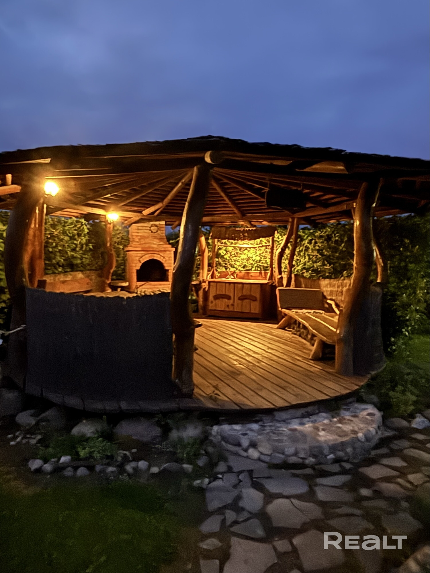 Большая беседка со столом, лавками и лежанкой для отдыха, мангал, кострище для бесед. Парковка на 4 авто.