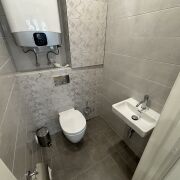 Раздельный санузел, где в туалете установлена компактная раковина, что позволяет удобно мыть руки сразу после использования, так же размещен бойлер, обеспечивающий горячую воду.