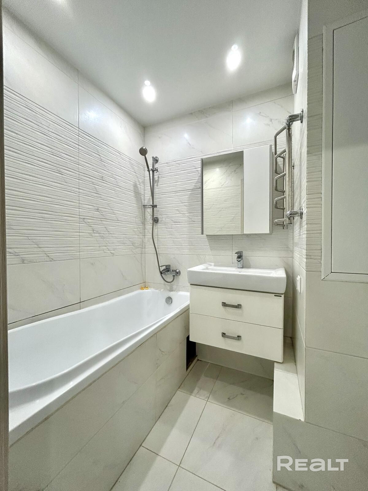 Квартира светлая с окнами в пол. Полностью укомплектована мебелью (встроенная кухня, стол с табуретами, мебель в ванной, тумба и шкаф) и бытовой техникой (холодильник, варочная поверхность, духовой шкаф, посудомоечная машина, вытяжка, микроволновая печь, стиральная машина).