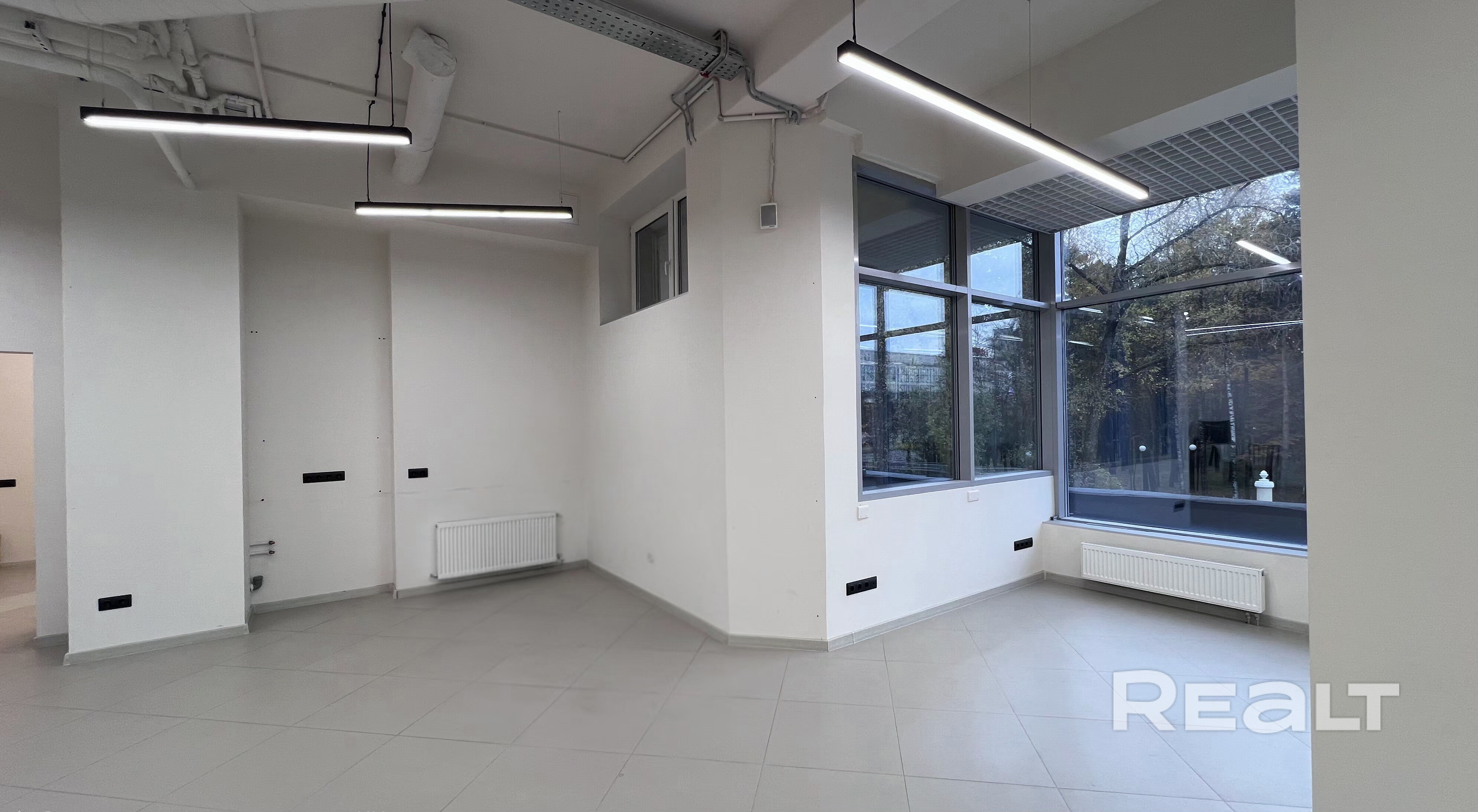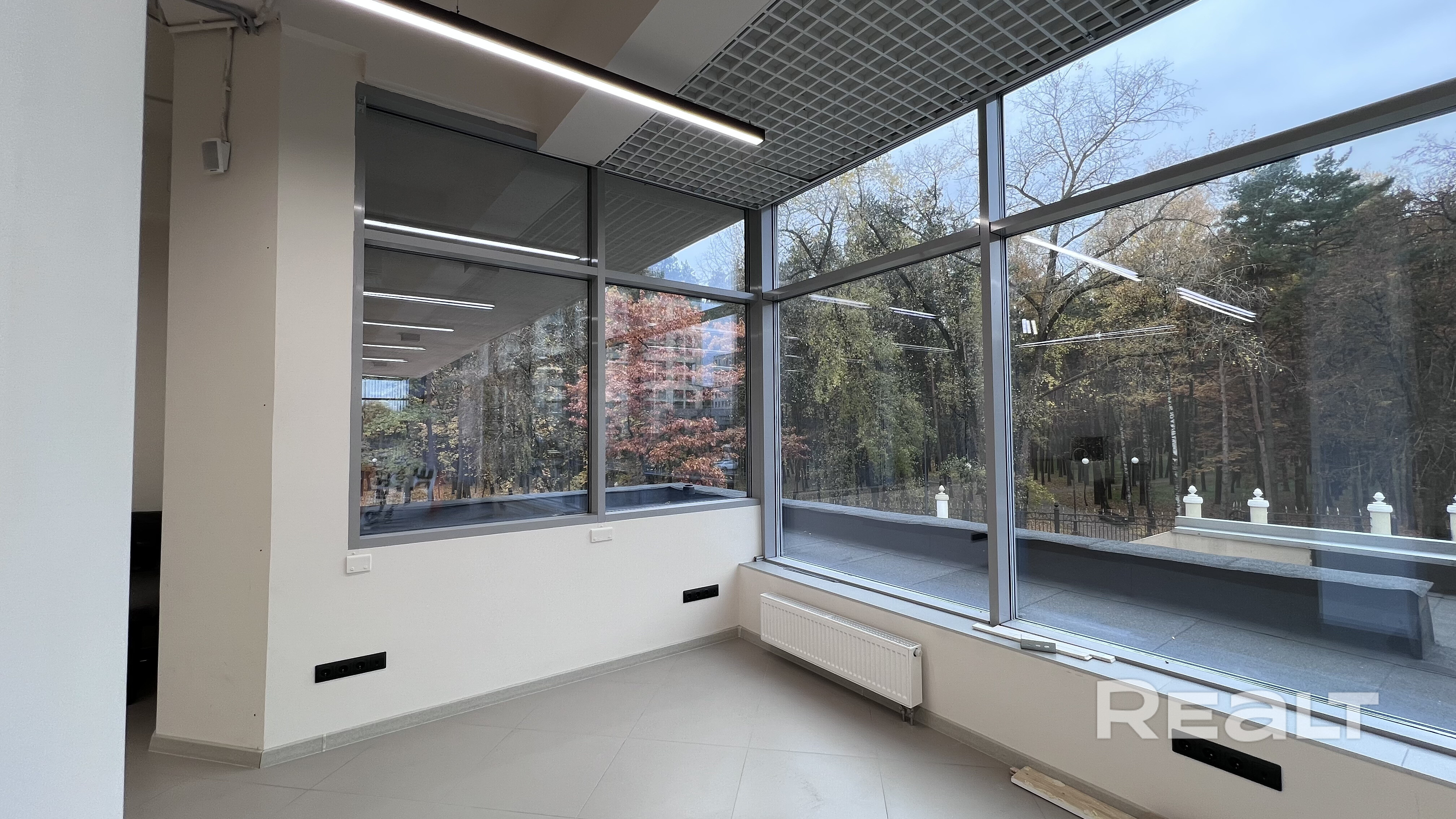 • Панорамные окна по периметру — идеальный дневной свет, эффект витрины, визуальный контакт с улицей