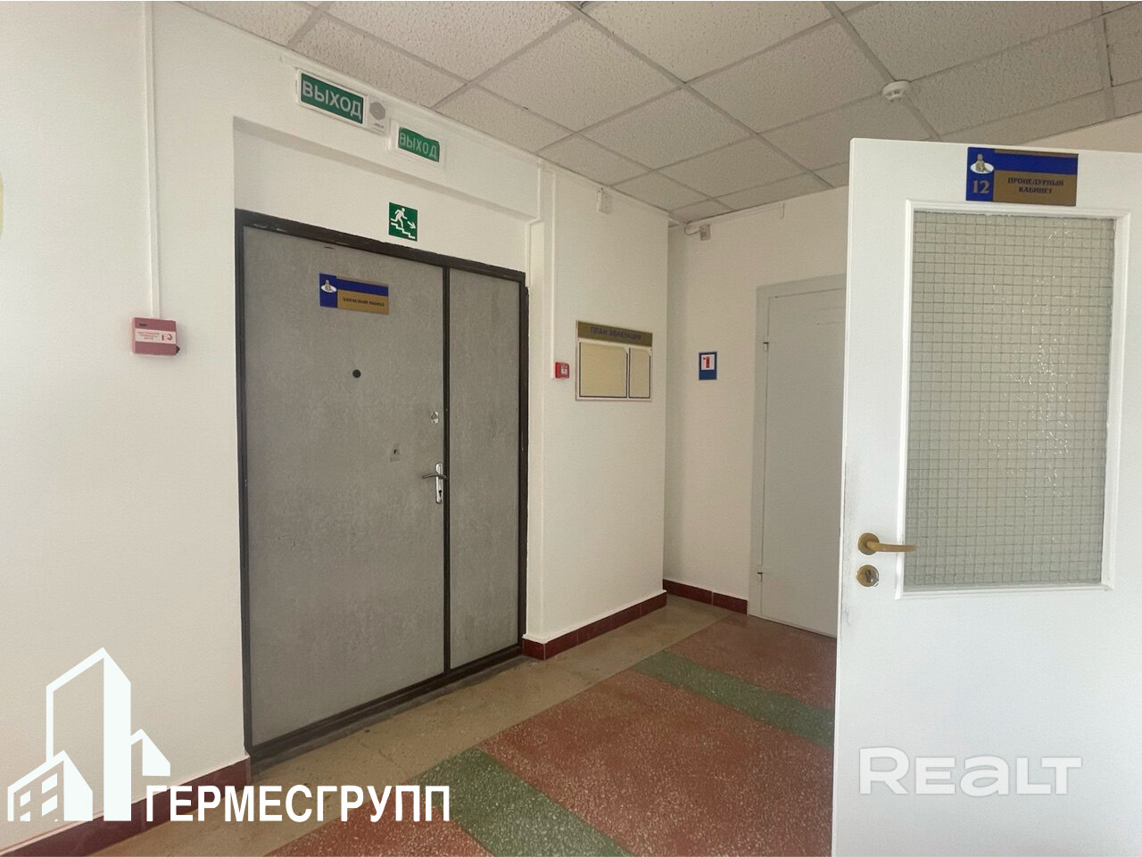 1. Два входа в помещение: главный вход (застекленный, дополнительно закрывается металлической дверью) и запасной выход с лестницей и лифтом.