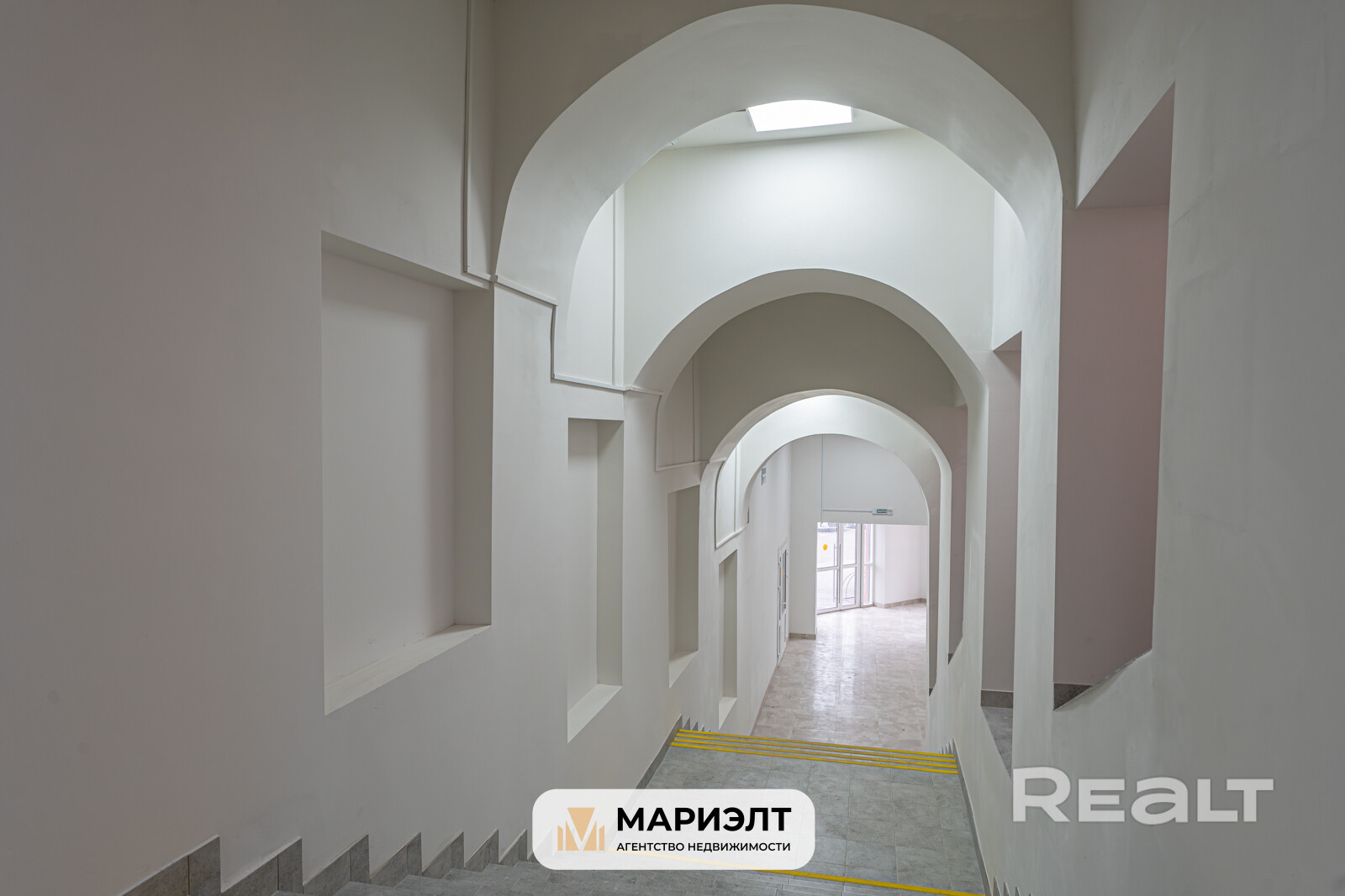 Помещение с ремонтом: белые стены, высокие потолки, естественное освещение.