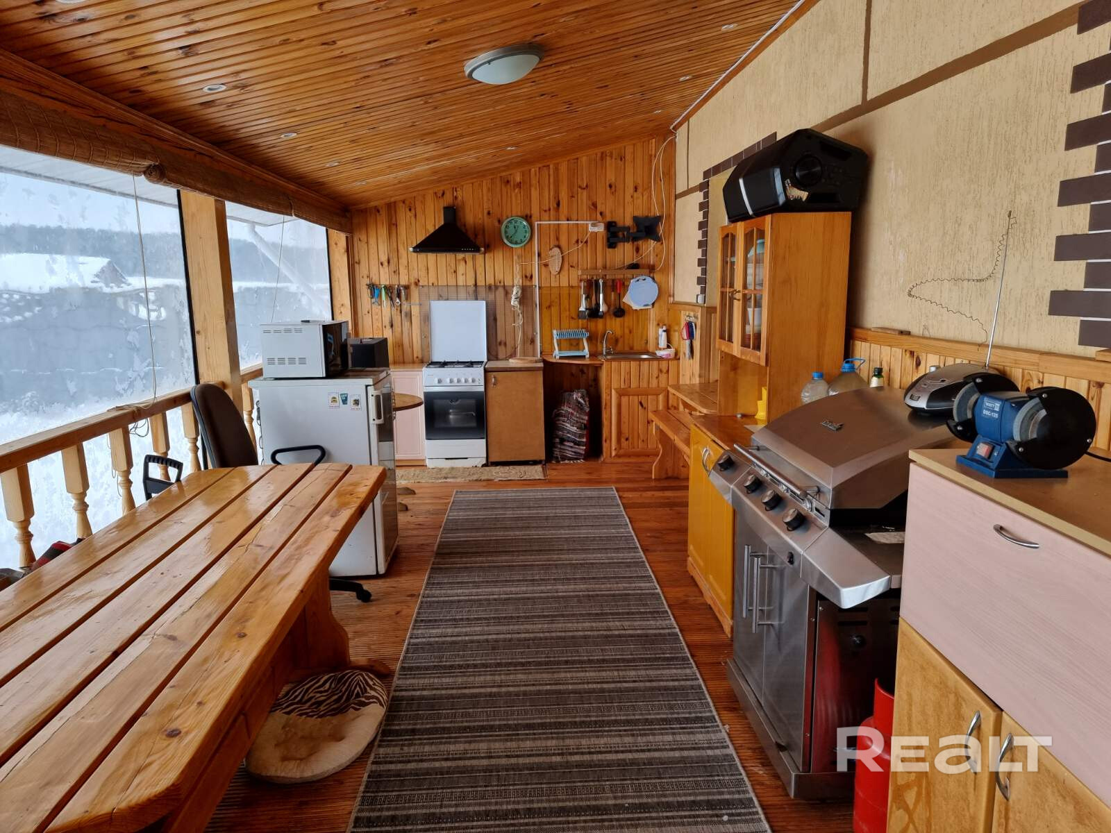 Летняя кухня-пристройка с мягкими стеклами. Мобильная баня из бруса. Теплица на фундаменте (6 на 10 м.), высота – 3,5 метра. Оборудована системой автополива, и имеет 4 входа. Помещение под инвентарь, закрытая дровница, металлический навес на два автомобиля. Дорожки из плитки.