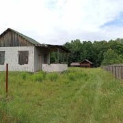 На участке расположены новый сруб (бревенчатая баня по проекту) и дом (коробка), по периметру участка залит фундамент под забор, вкопаны столбы, натянуты металлические жилы.