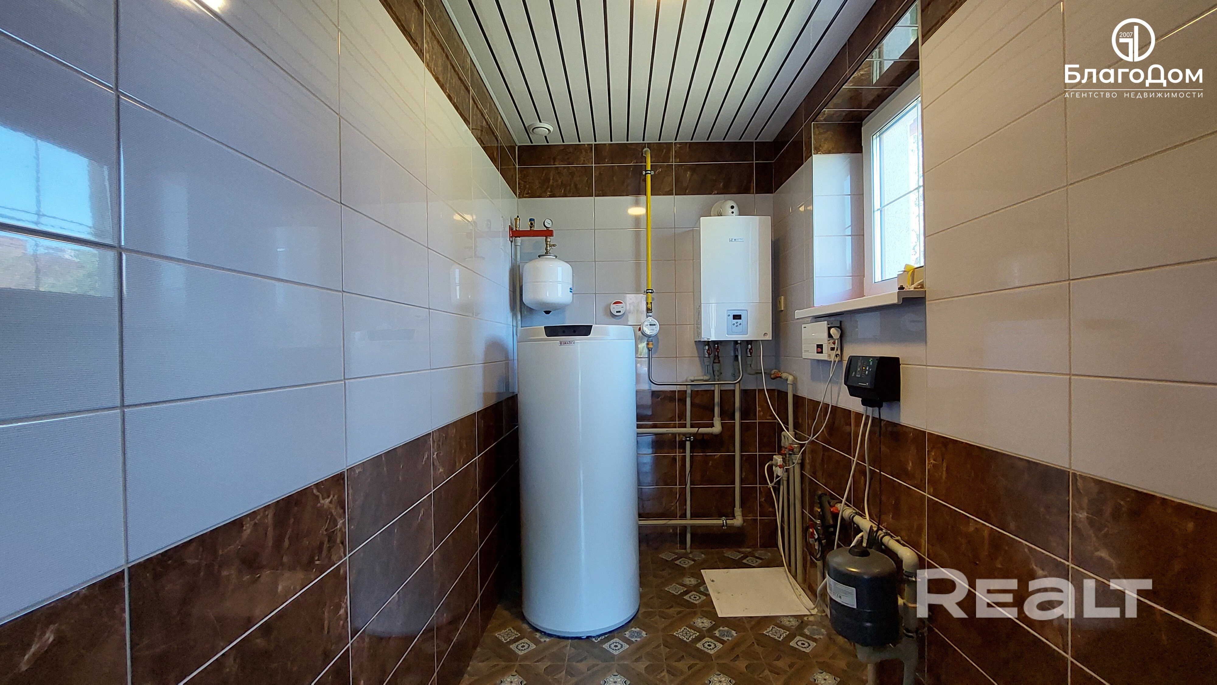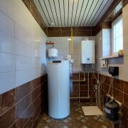 Отопление газовое - котел двухконтурный, канализация - локальная, вода - скважина 85 метров, электричество 220/380Вт.