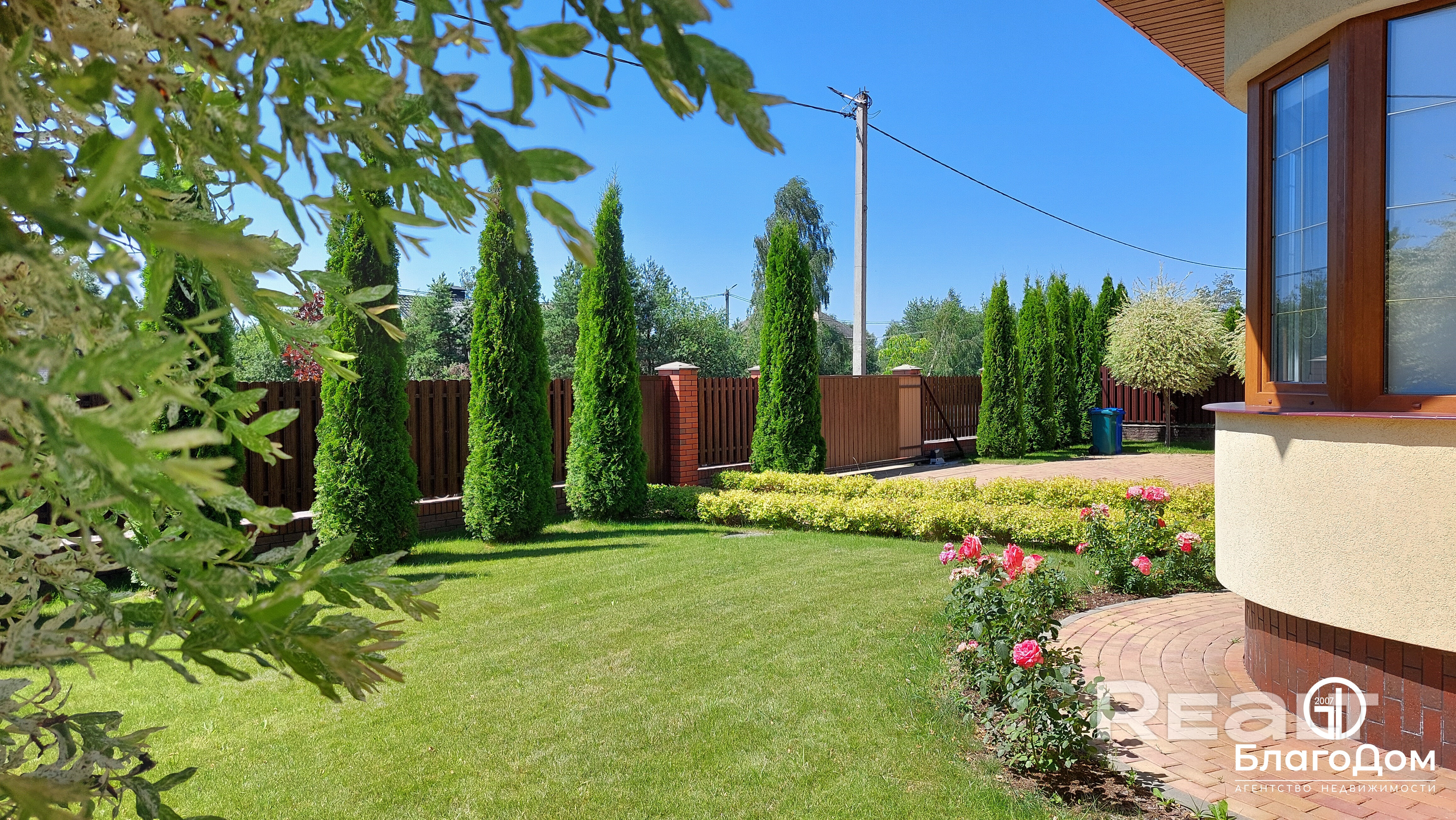 На территории выполнен ландшафтный дизайн. Засажены декоративные деревья и кустарники, плодоносящий сад, газон с подсветкой оборудована автоматическая система полива газона.