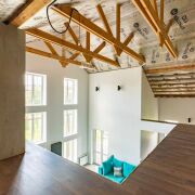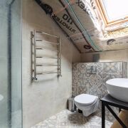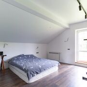 Массивная лестница из металлического каркаса, привлекает внимание своей формой и выступает как отдельный архитектурный элемент. На втором этаже две изолированные комнаты, которые можно организовать как детские. Окна выходят на сторону, где участок граничит с лесополосой. Санузел оборудован душевой кабиной. Под скатом крыши организовано просторное помещение для хранения.
