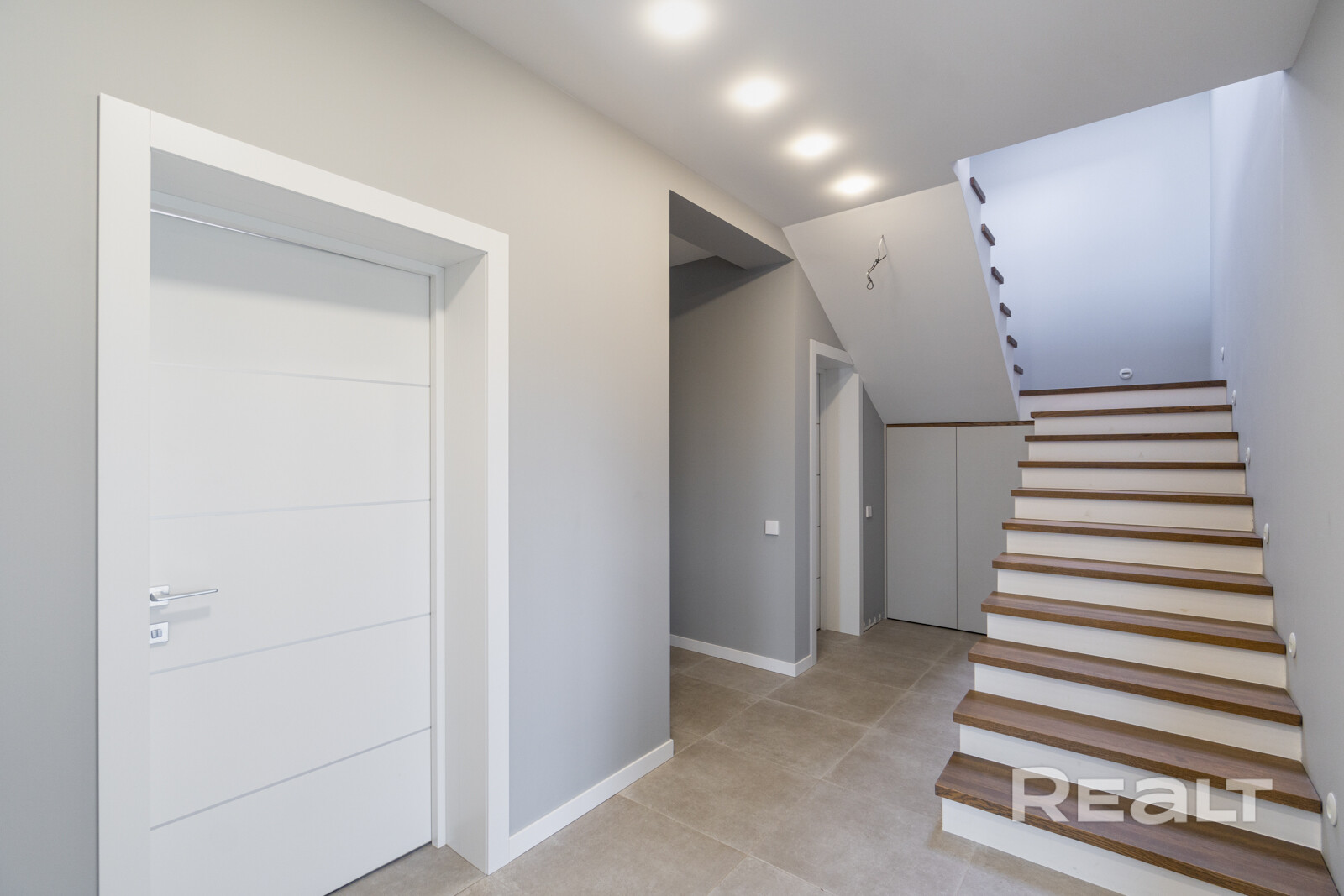 Отделка: широкоформатный керамогранит в зоне камина, керамогранит на первом этаже, на втором – ламинат 12мм, лестница выполнена из дуба. Двухкамерные стеклопакеты немецкого производителя.