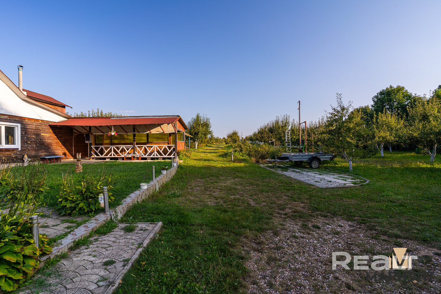 Территория в 25 соток, на которой расположены два дома, пруд с рыбами, огромный сад с плодовыми деревьями (80 груш и 100 яблонь), 700 кустов голубики, орехи, другие кустарники.