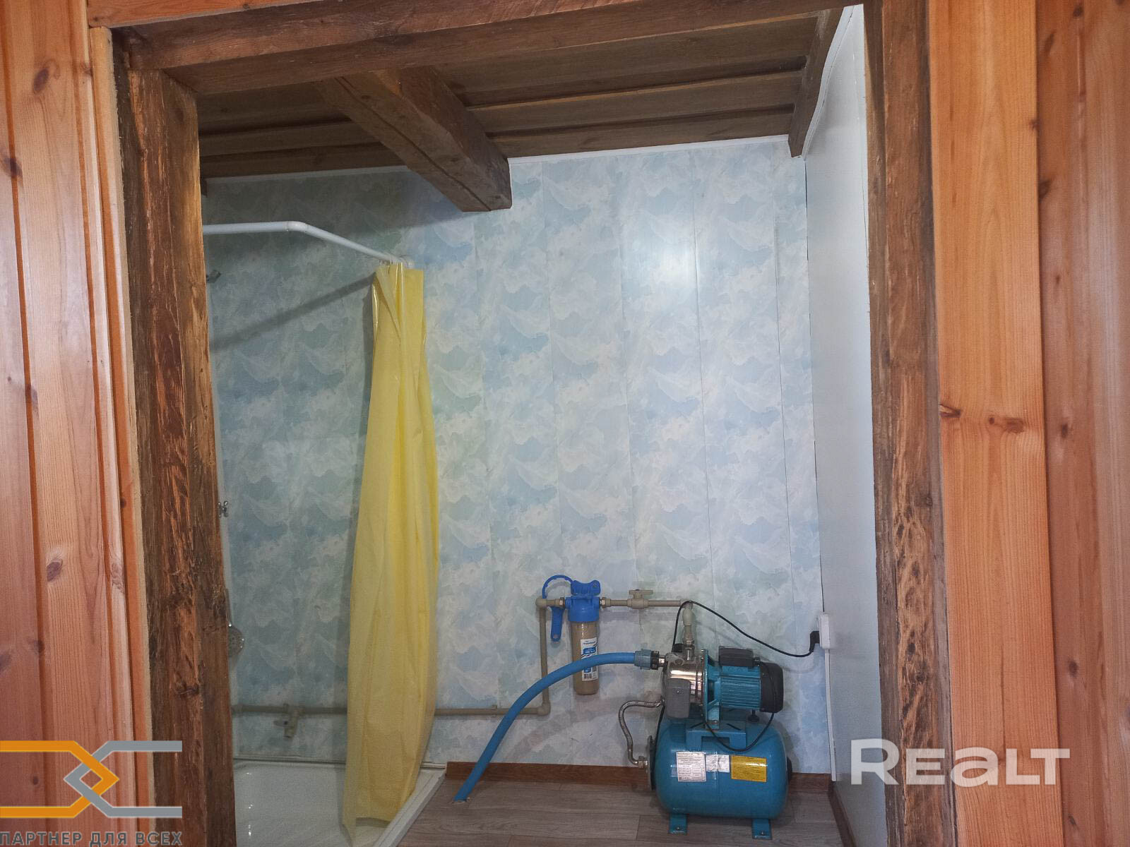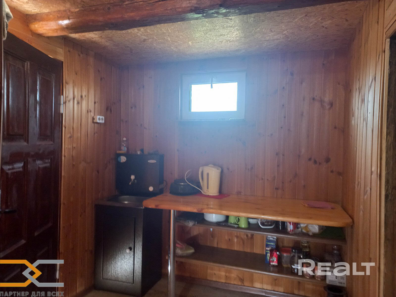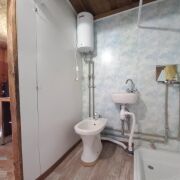 К дому сделана пристройка (входная часть, прихожая) площадью около 5 кв.м. Сам дом состоит из кухни (4.4 кв.м), санузла (3.5 кв.м) и жилой комнаты 16.2 кв.м. Вода в дом заведена из колодца, подогревается бойлером. Канализация выведена - местная.