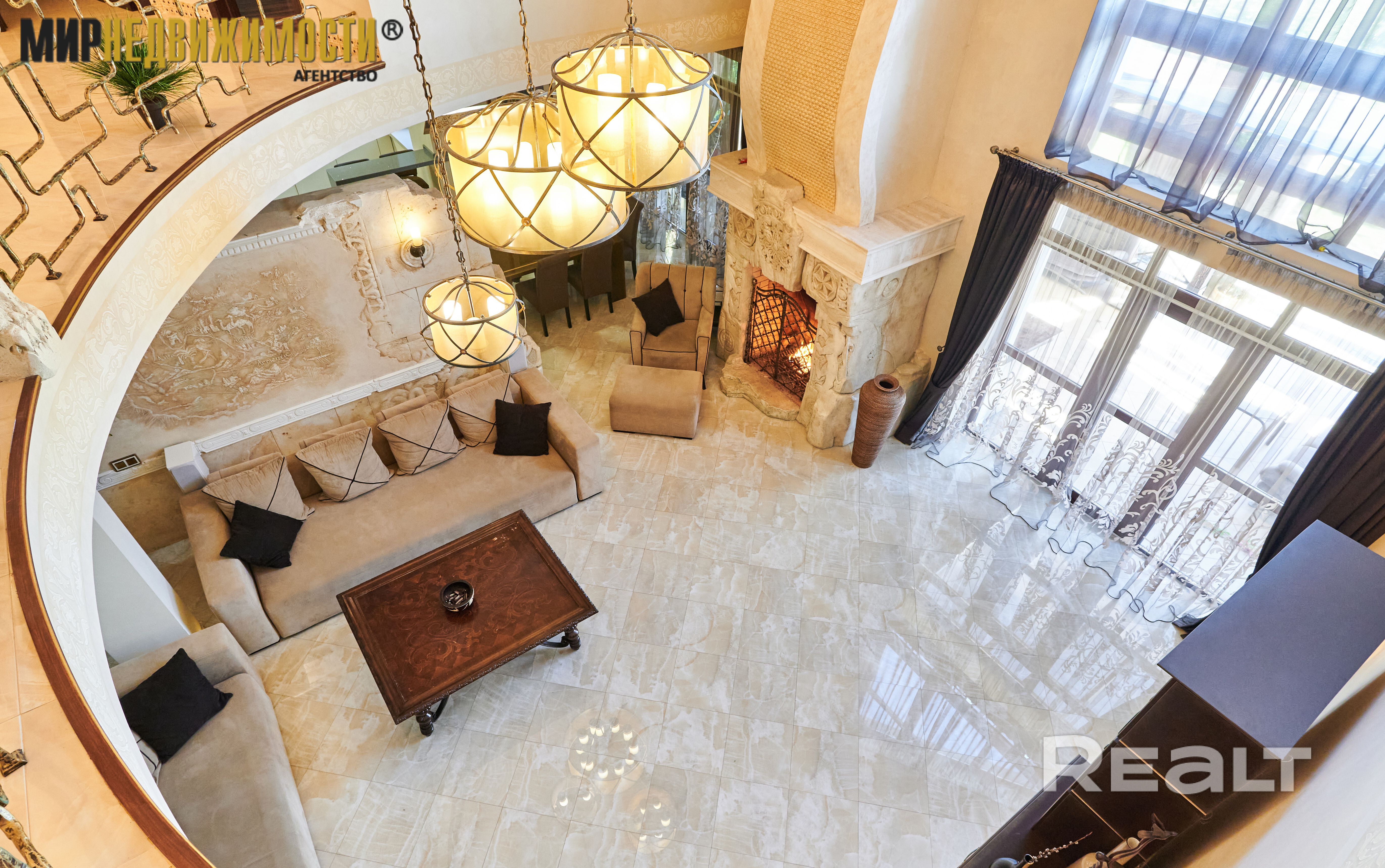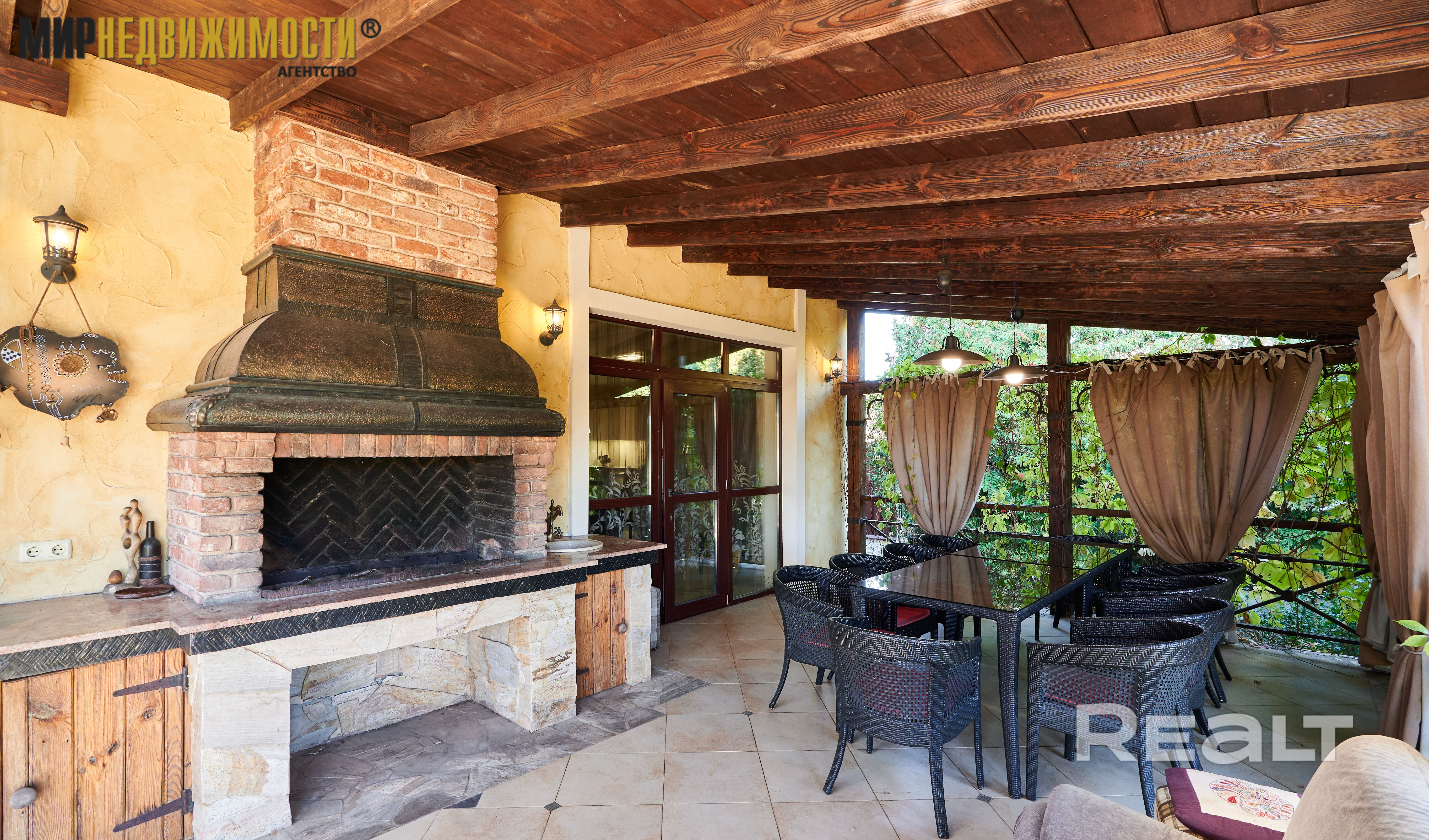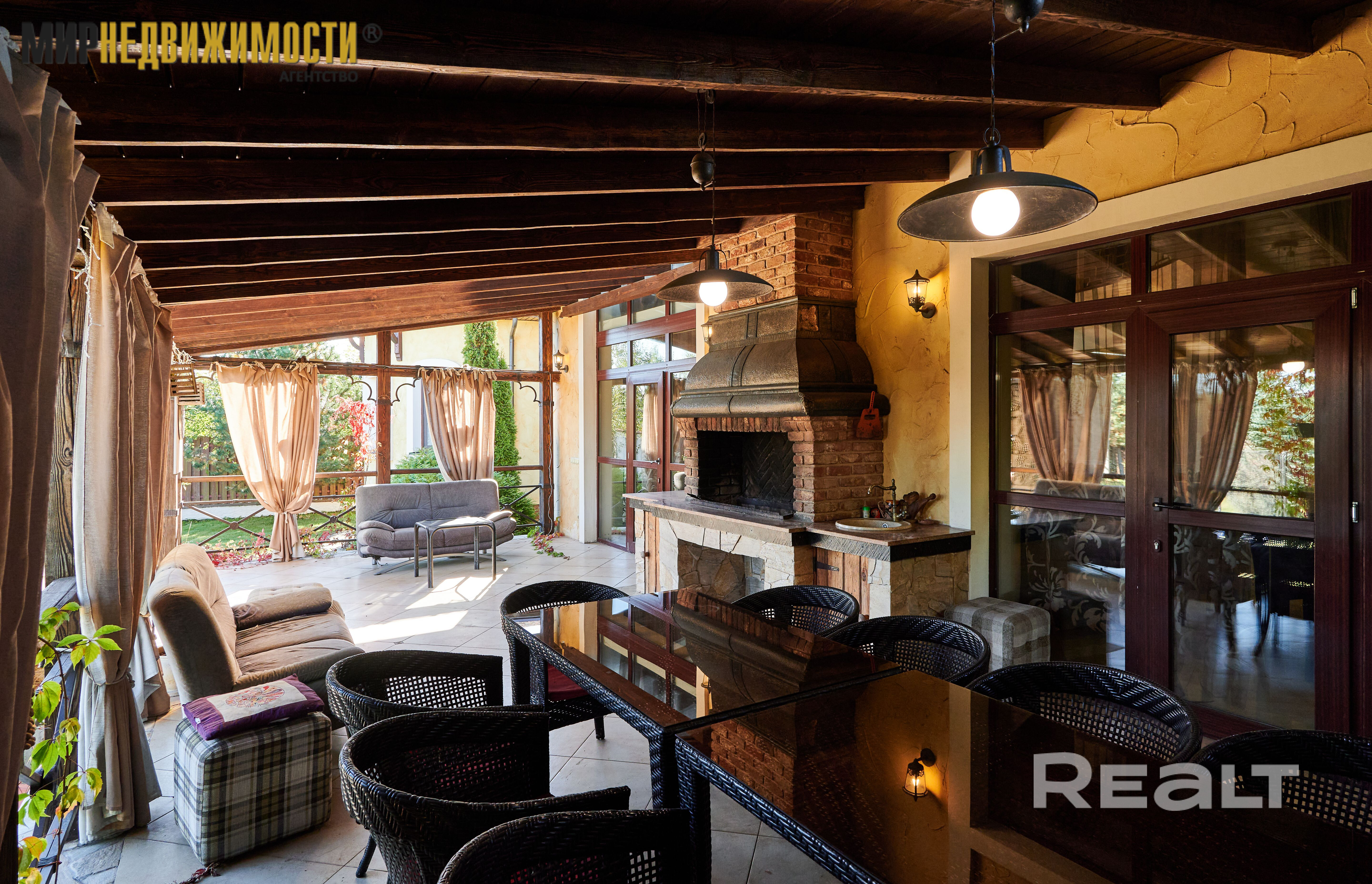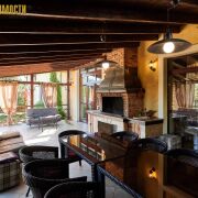 - кухня с большой обеденной зонной 30,1 кв.м., гостиная 42,4 кв.м. с выходом на террасу. В гостиной второй свет и большой камин открытого типа. Терраса с навесом, открытая, большая печь для барбекю;