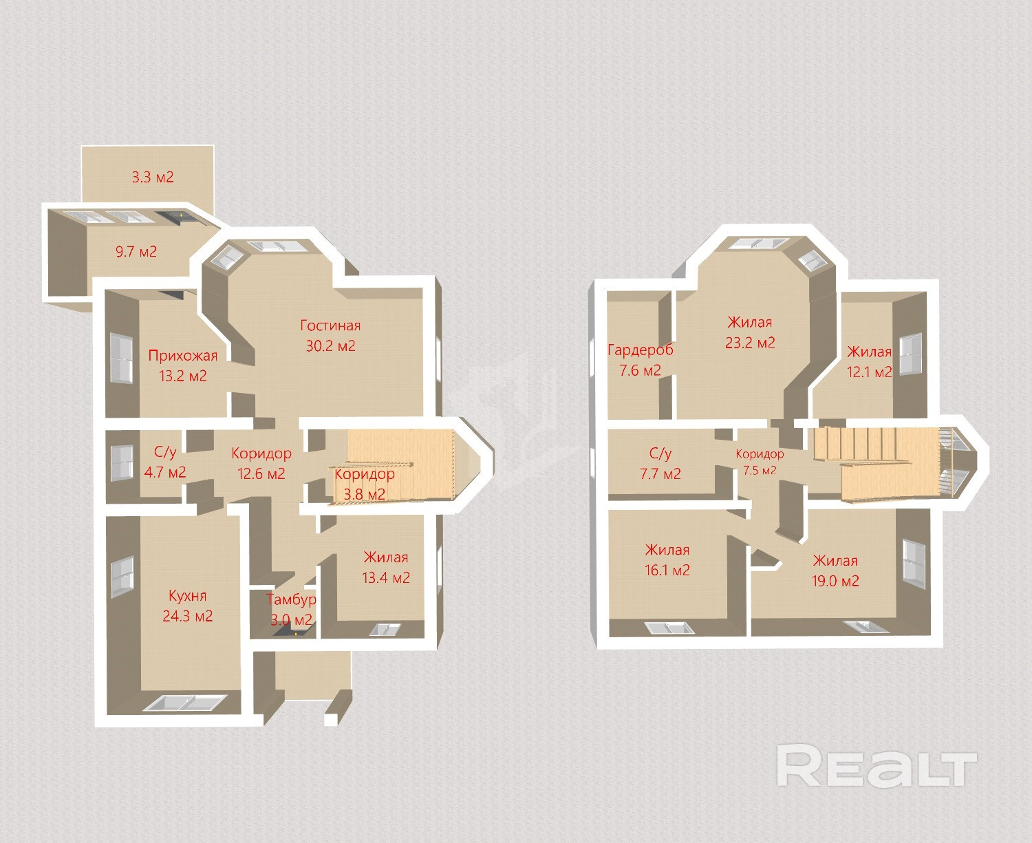 На первом этаже расположились просторная (30,2м2) гостиная с эркерным окном. Почти не уступает гостиной в размере двадцатичетырёхметровая кухня! Хол – 13 м2 Тринадцатиметровая комната кажется маленькой на общем фоне. На втором этаже – четыре умеренно просторные комнаты (23, 19, 16 и 12 квадратных метра). К большой комнате примыкает восьмиметровая гардеробная