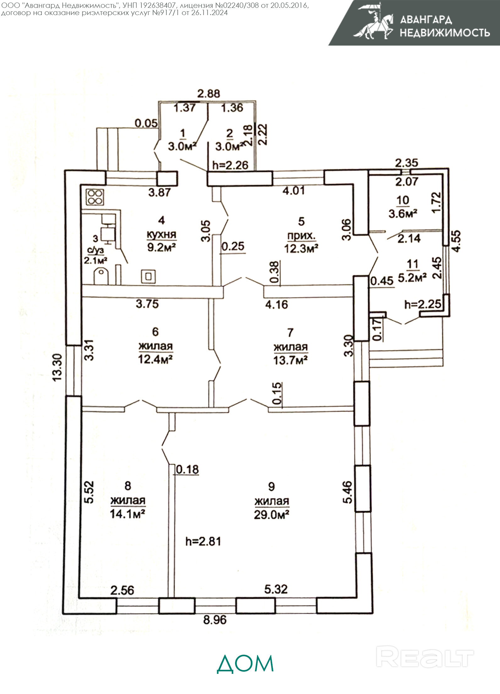 2. Строение: Дом 1970 года постройки. Один жилой этаж с очень высокими потолками. Отличная продуманная планировка, кухня небольшая, 4 комнаты, санузл, топочная и две веранды с выходом на разные стороны дома. Общая площадь 107,6/69,2, материал стен – кирпич с толщиной стен около 50см, перекрытие – деревянное, крыша – шифер. Есть чердак. Полы деревянные. К дому подведена силовая трехфазная линия. Есть возможность проведения телефона и интернета.