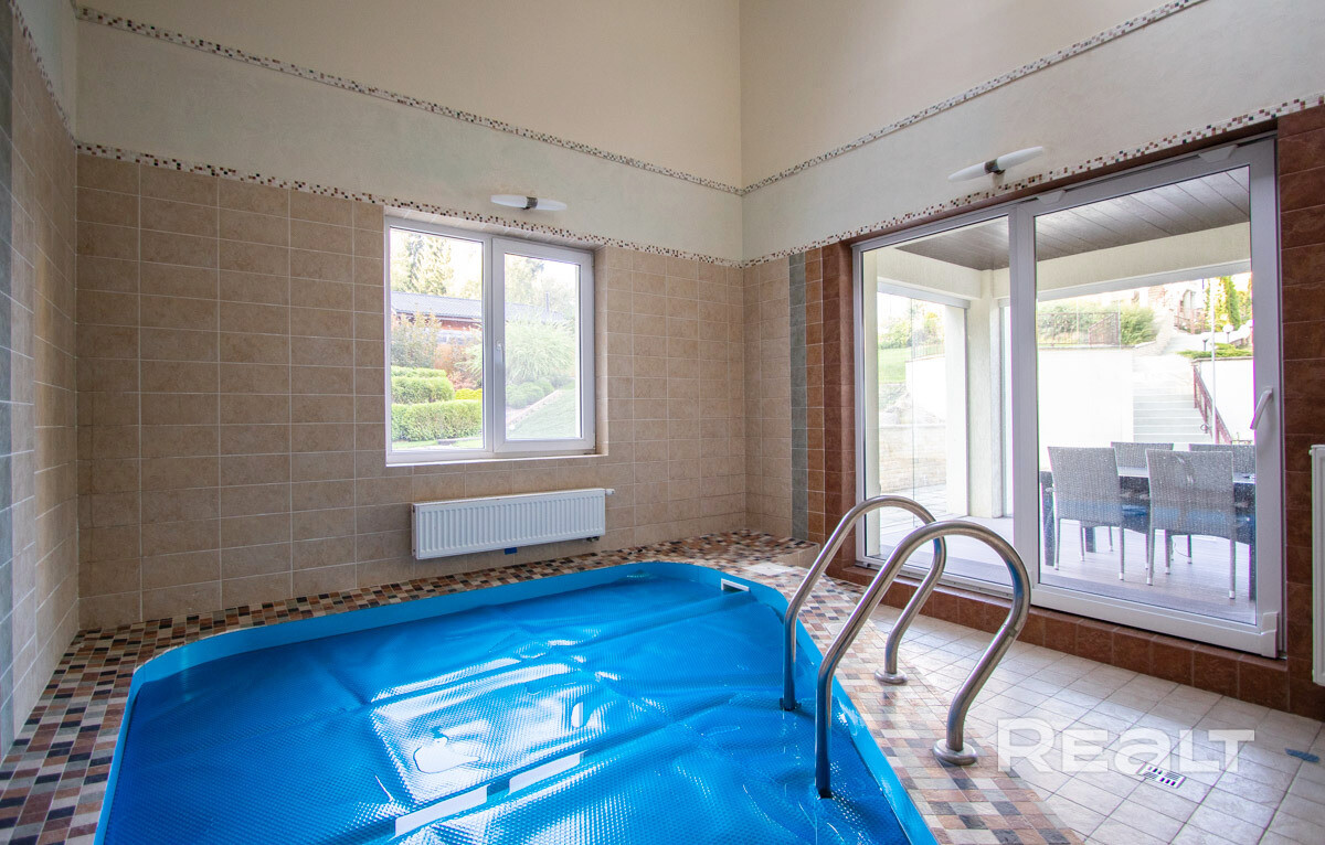 - Зона отдыха с мини-кухней и массажным креслом, парилка на дровах, с/у, бассейн с подогревом и системой фильтрации, выход на террасу с обеденной зоной, с видом на водопад и пруд (пруд с системой очистки). Отопление - теплый пол + радиаторы 2-й этаж-холл со спальным местом, спальня.