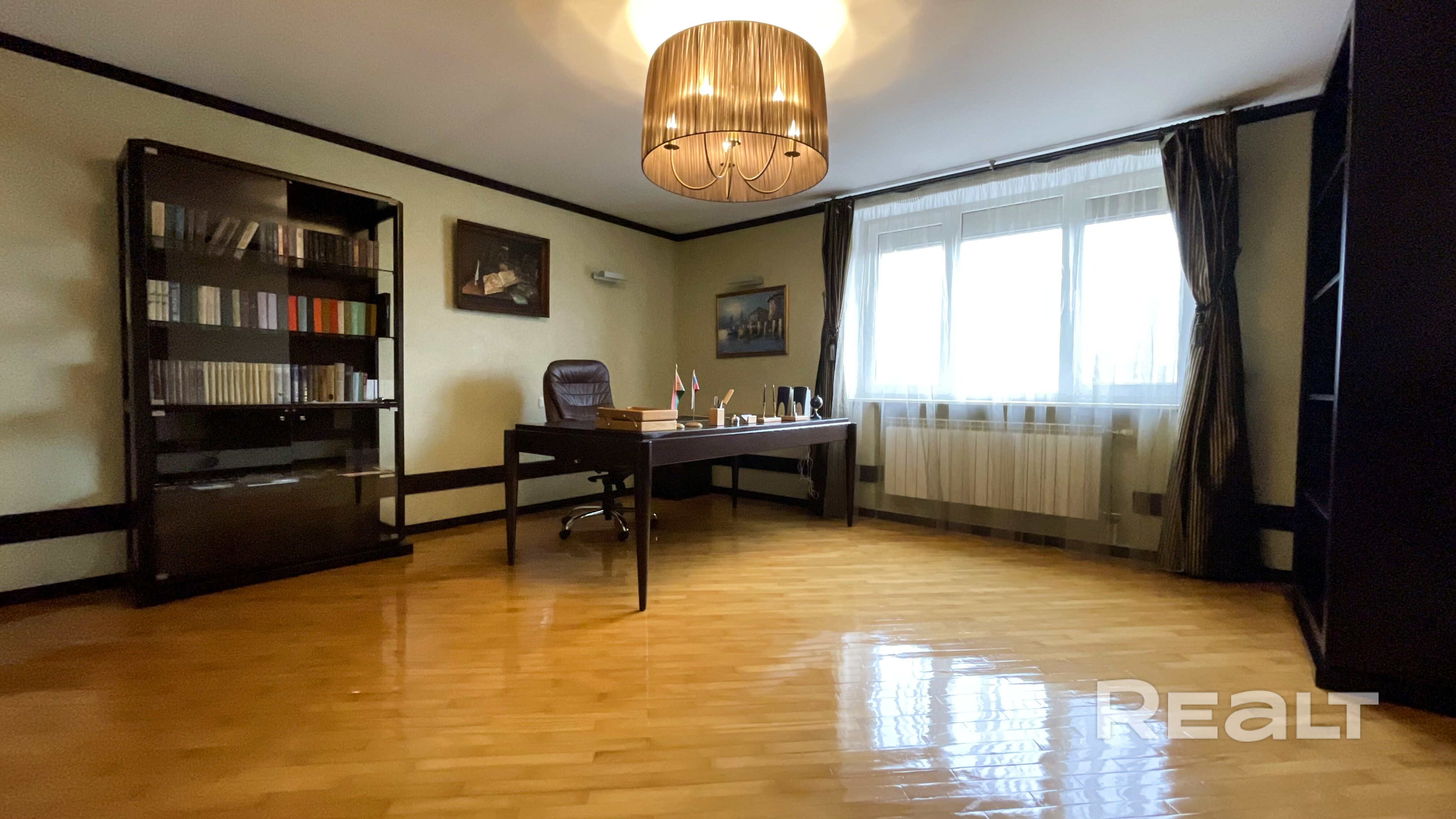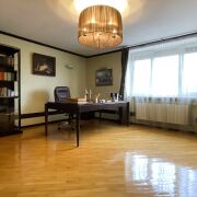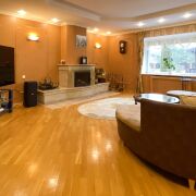Напольное покрытие на первом этаже паркет(гостиная) и плитка (кухня, зимний сад, постирочная, санузлы). Второй этаж ламинат. На третьем этаже паркет (кабинет, гардеробная), в спальне ковровое покрытие и в санузле плитка.