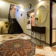 Стены первого этажа декоративная штукатурка с элементами ручной росписи на кухне и в холле. Второй этаж декоративна штукатурка. Спальня 3 этажа обои, кабинет штукатурка.