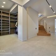 Первый этаж. Просторная гостиная с кухней и панорамными окнами, что обеспечивает поступление большого количества естественного света и визуальное увеличение пространства. Из кухни выход на террасу, отдельная кладовая для хранения. Гардеробная, санузел, кабинет, холл и прихожая.